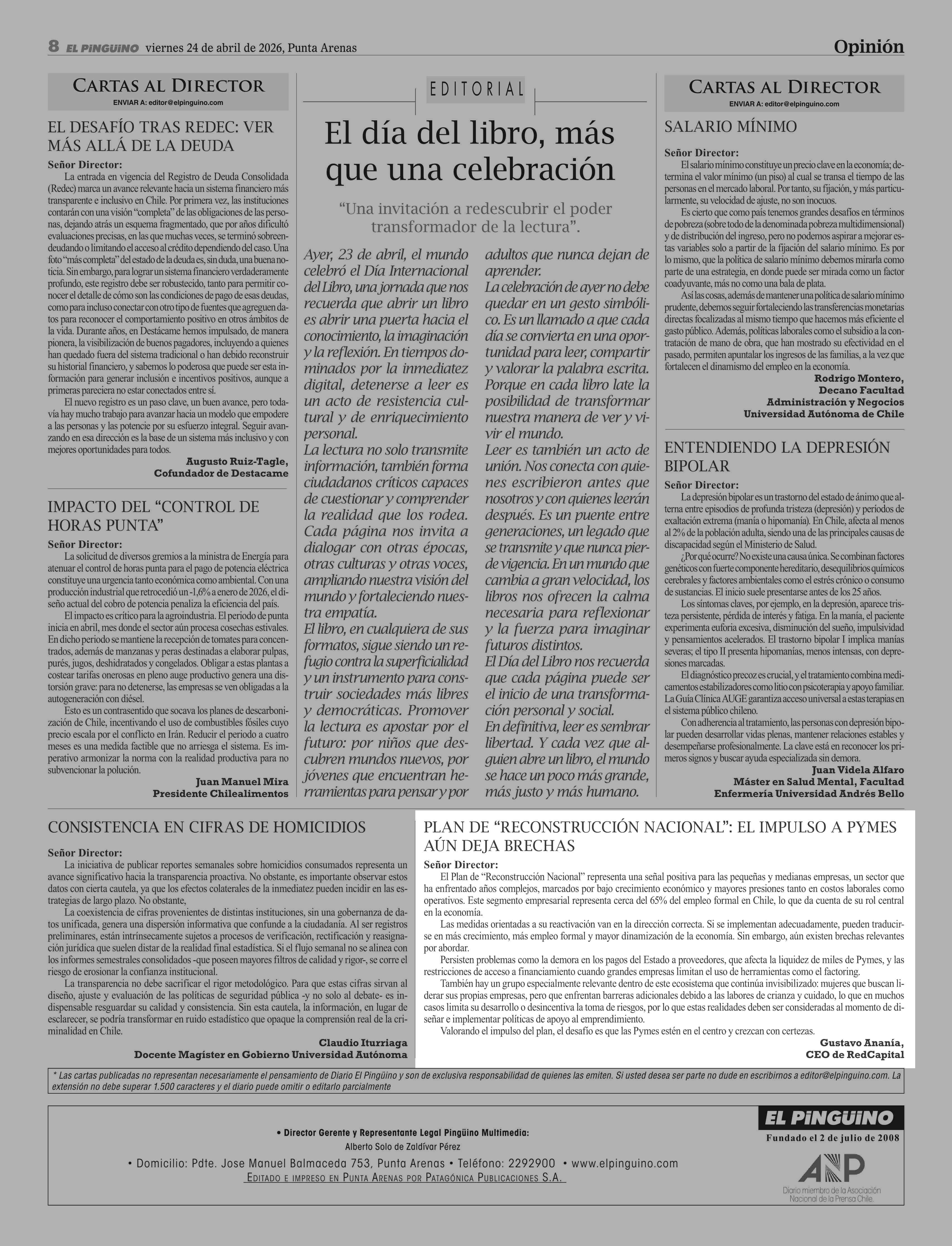Cartas: plan dE “rEconStrucción nacional”: El impulSo a pymES aún dEja BrEchaS 24-04-2026 El Pingüino |
