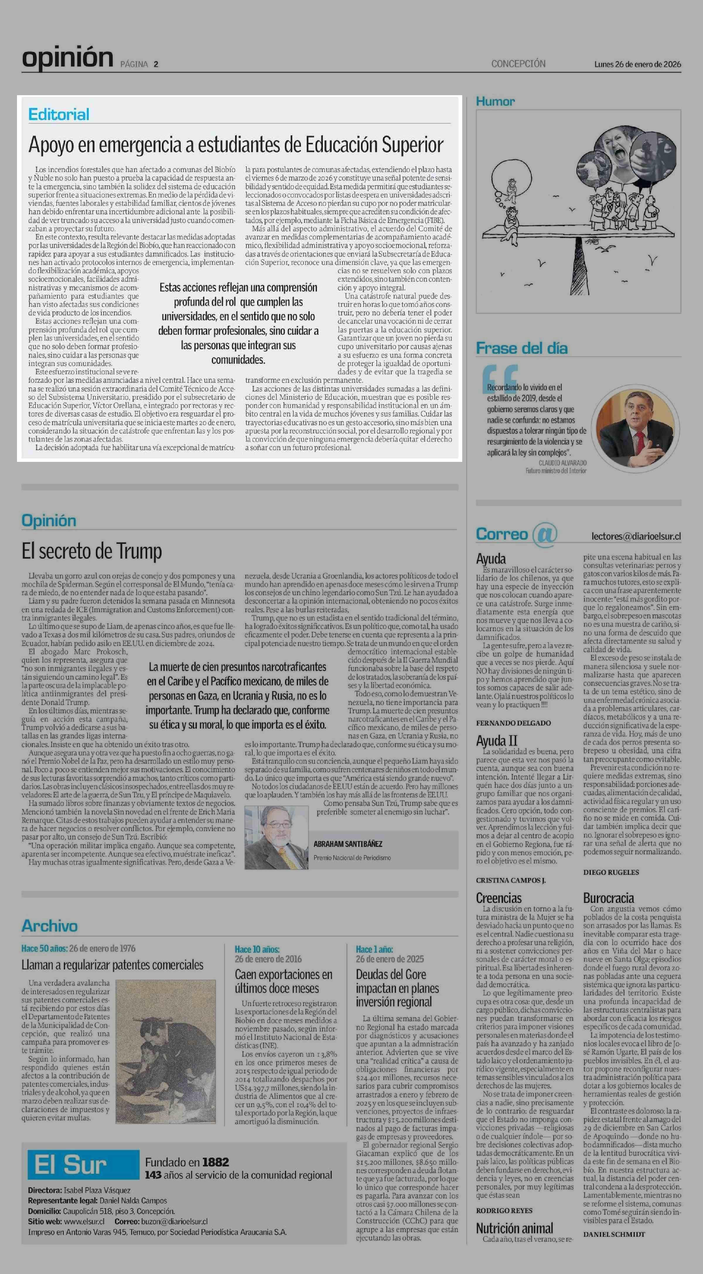 Editorial: Apoyo en emergencia a estudiantes de Educación Superior 26-01-2026 El Sur |