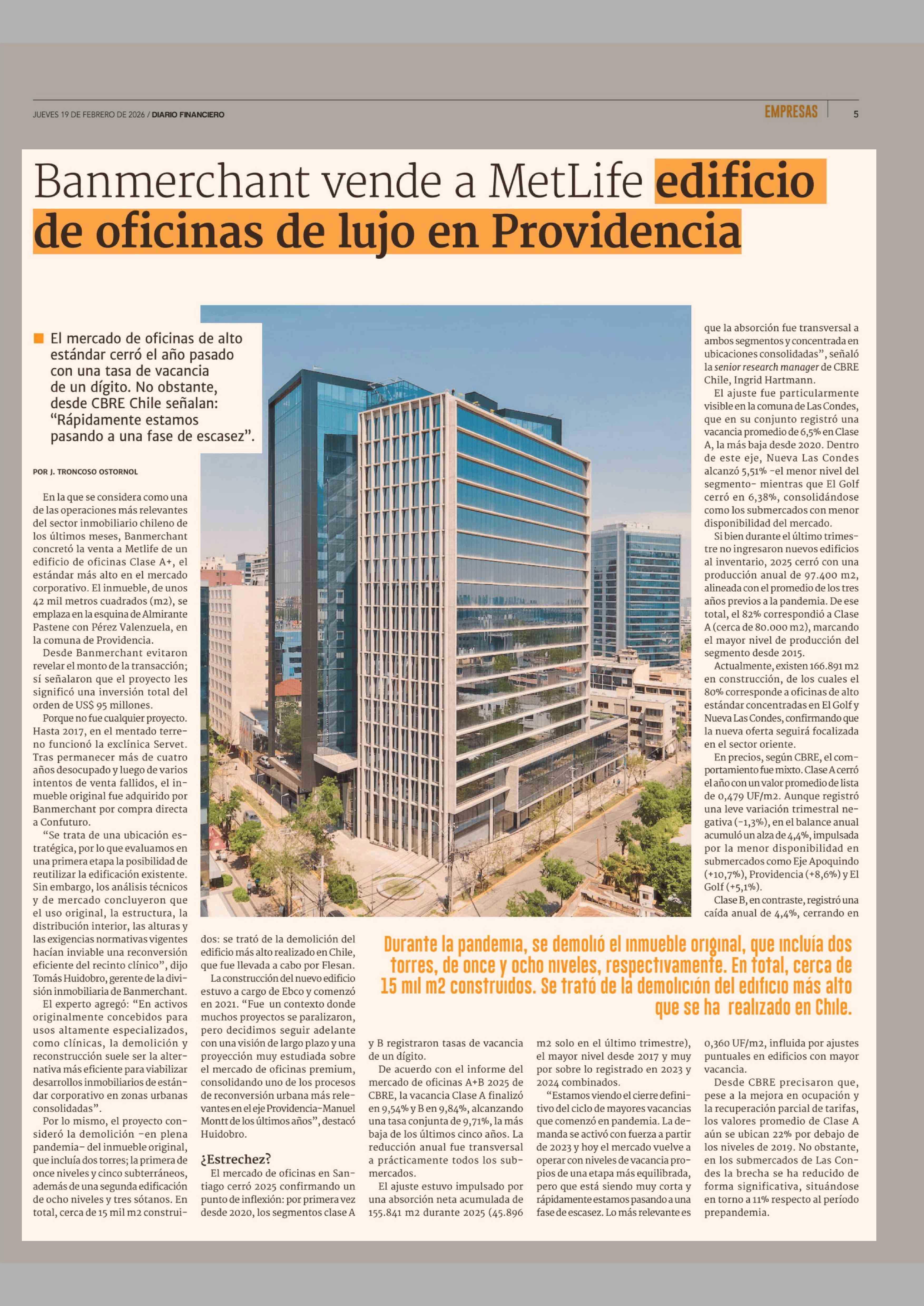 Banmerchant vende a MetLife edificio de oficinas de lujo en Providencia 19-02-2026 Diario Financiero |