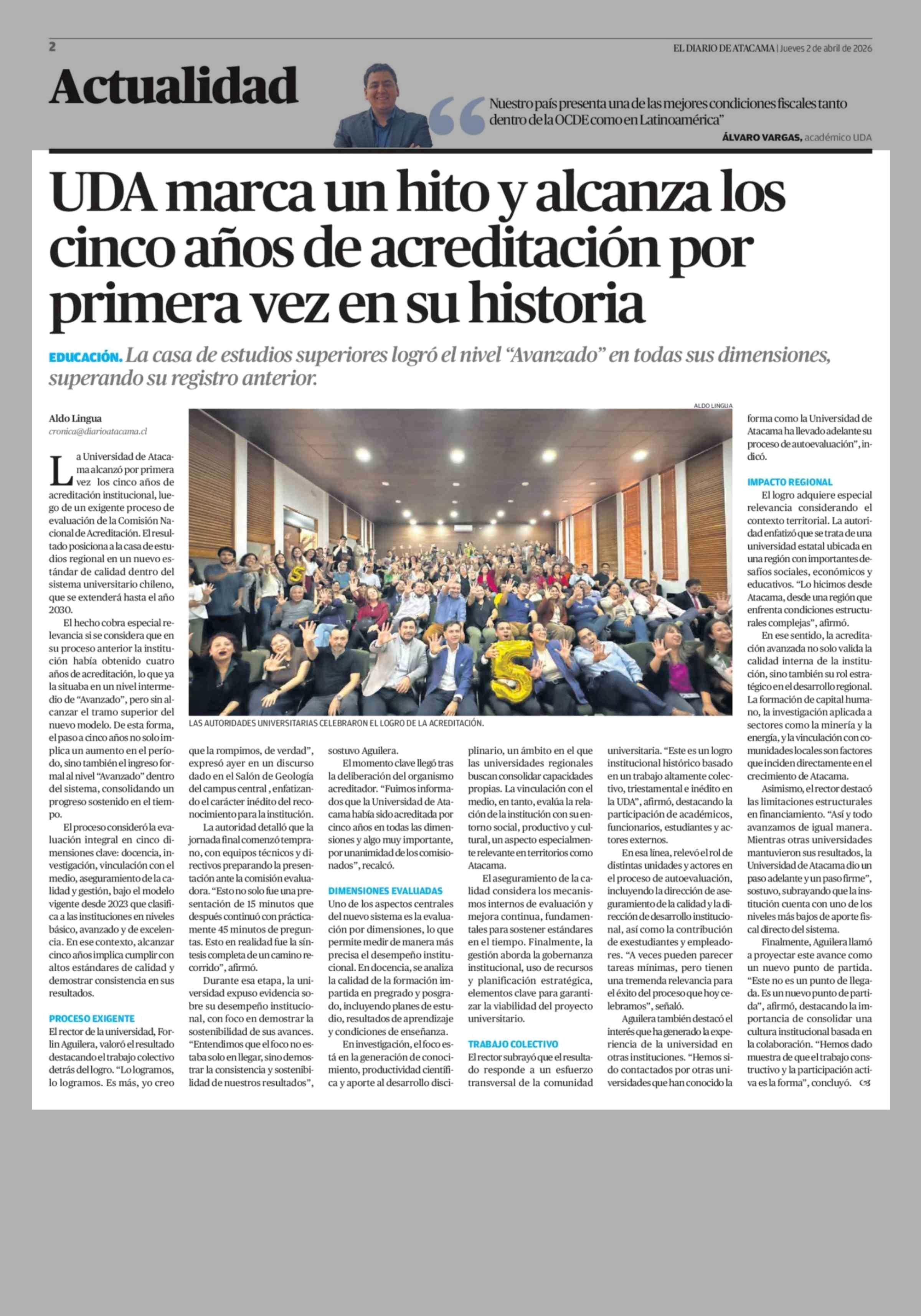 UDA marca un hito y alcanza los cinco años de acreditación por primera vez en su historia 02-04-2026 El Diario de Atacama |