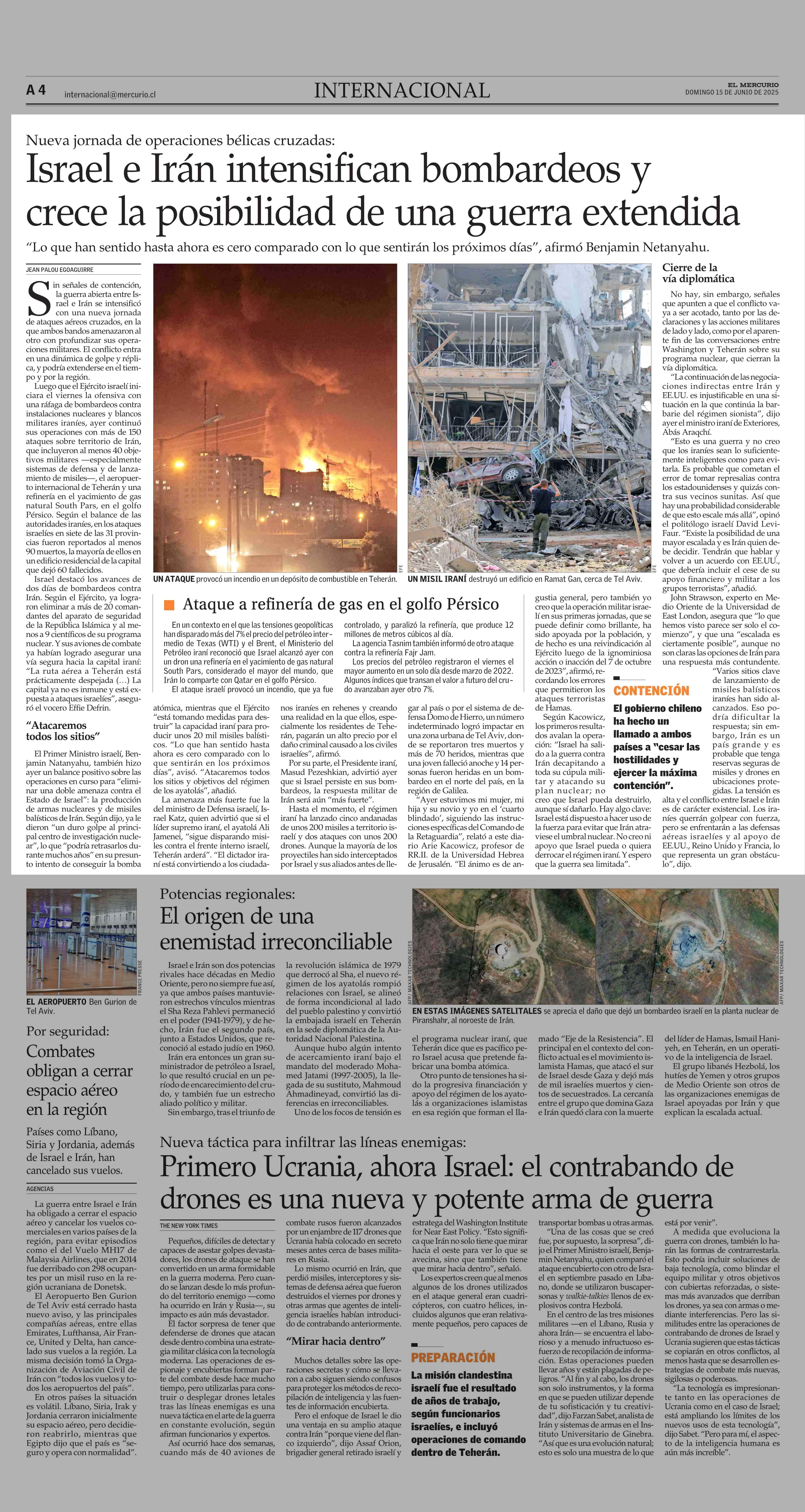 Israel e Irán intensifican bombardeos y crece la posibilidad de una guerra extendida 15-06-2025 El Mercurio |