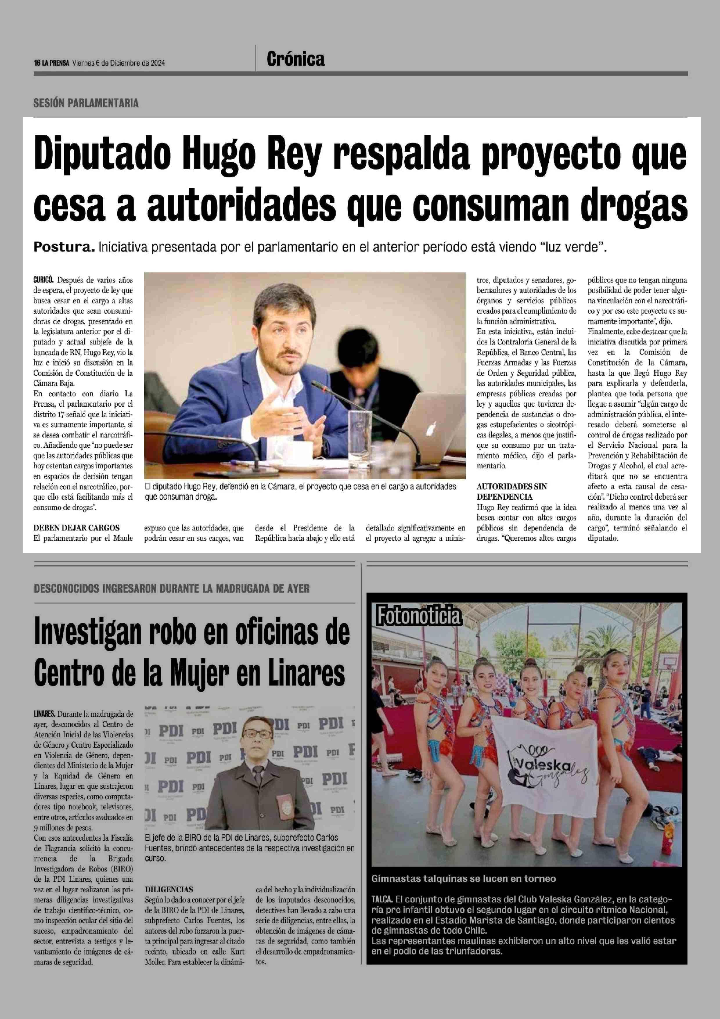 Diputado Hugo Rey respalda proyecto que cesa a autoridades que consuman drogas 06-12-2024 La Prensa de Curicó |
