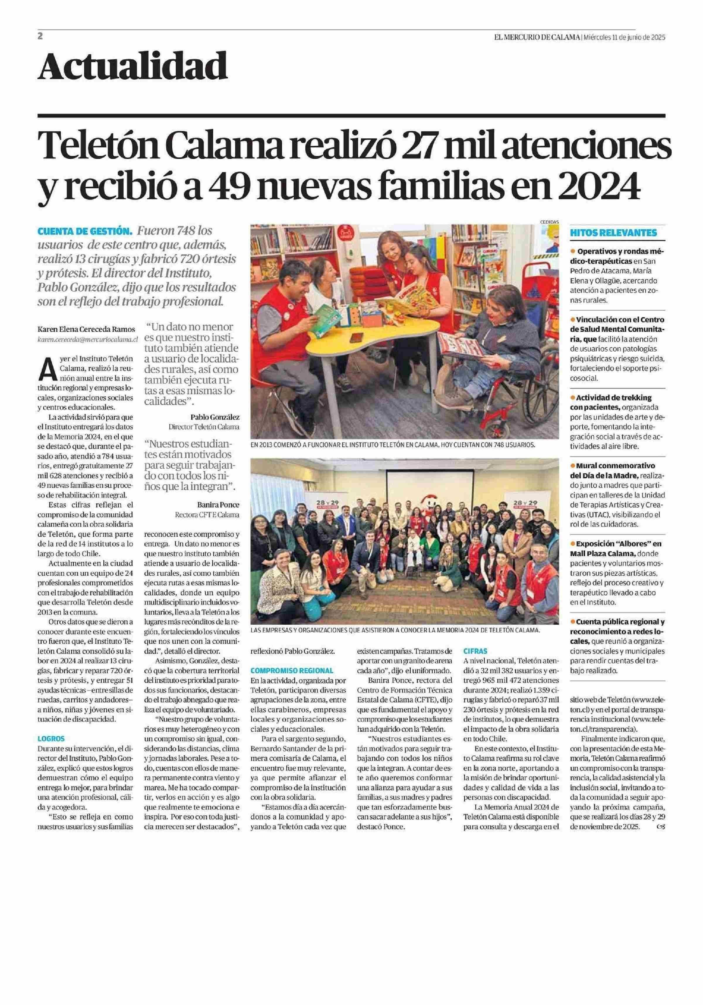 Teletón Calama realizó 27 mil atenciones y recibió a 49 nuevas familias en 2024 11-06-2025 El Mercurio de Calama |
