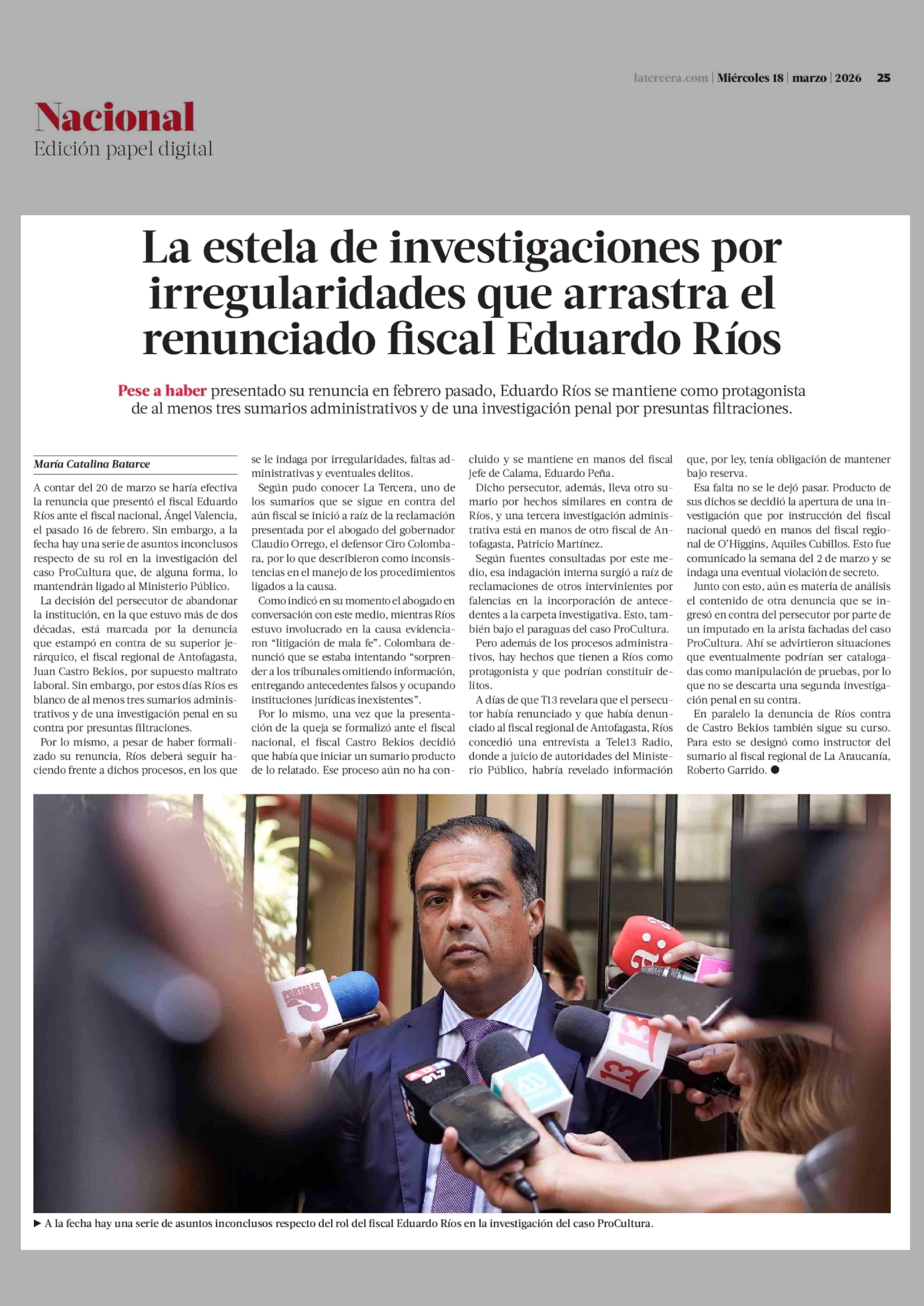 La estela de investigaciones por irregularidades que arrastra el renunciado fiscal Eduardo Ríos 18-03-2026 La Tercera |