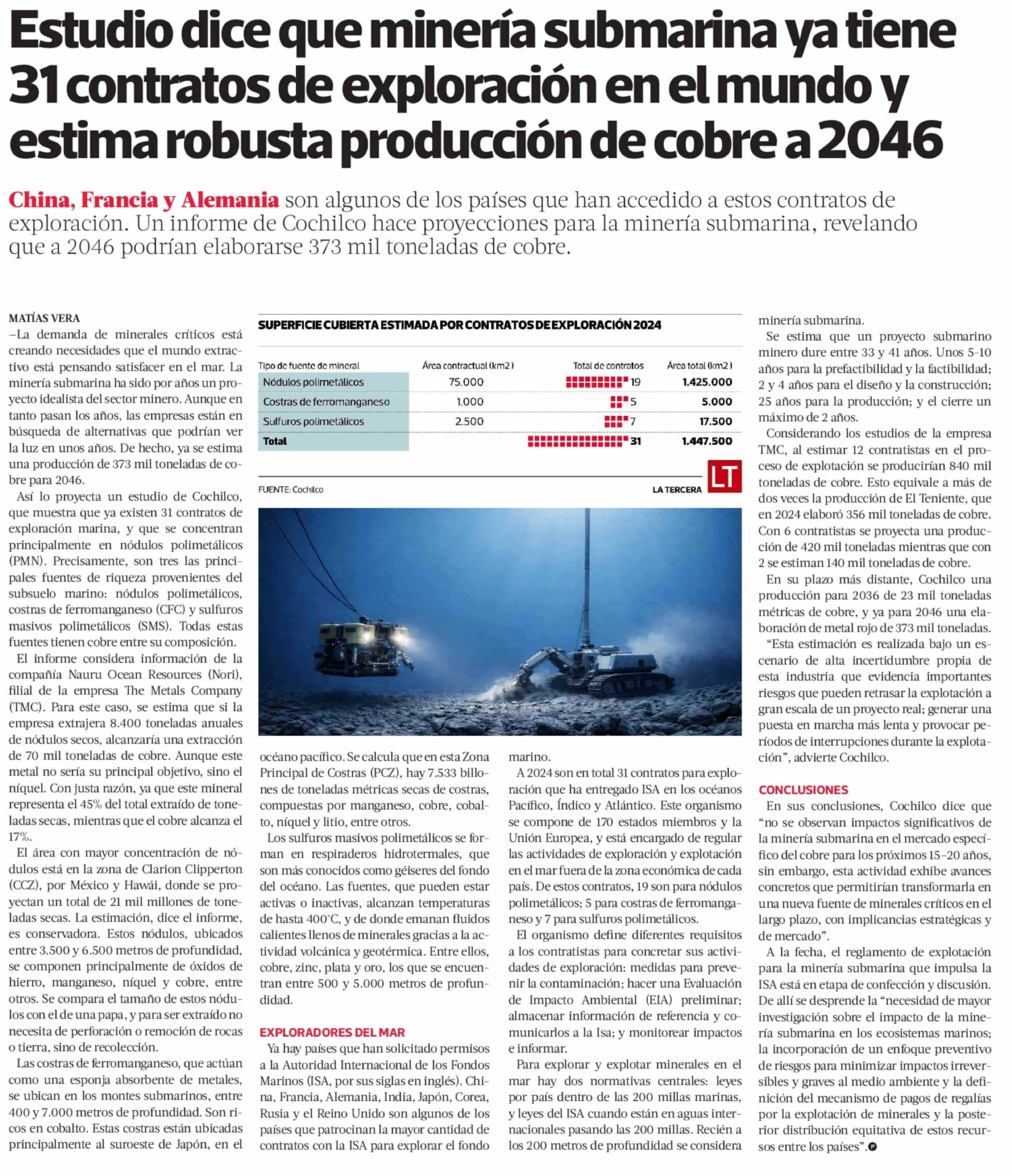 | Título: | Estudio dice que minería submarina ya tiene 31 contratos de exploración en el mundo y estima robusta producción de cobre a 2046 |