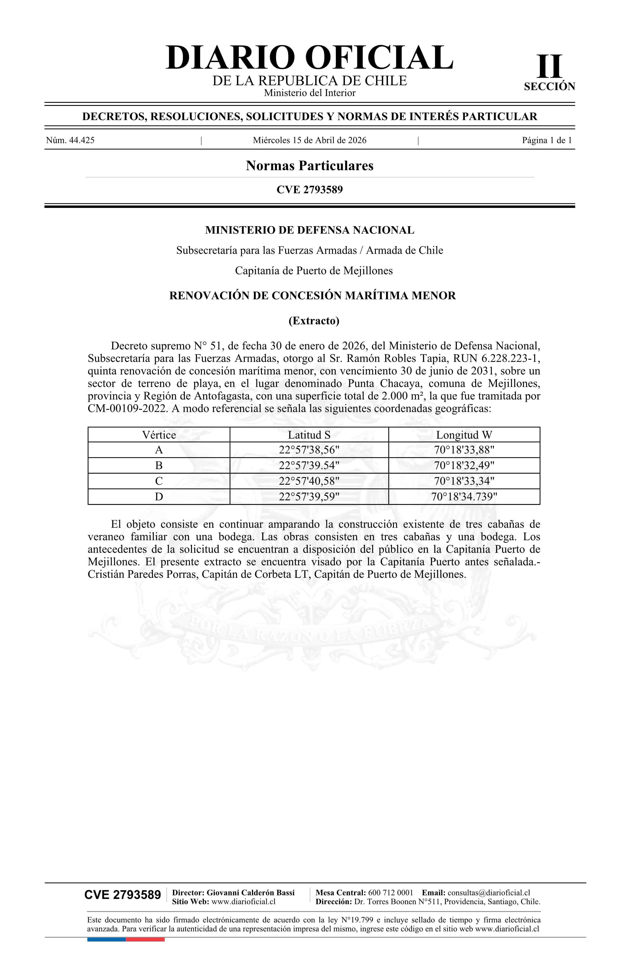Extracto de decreto número 51, de 2026.- Renovación de concesión marítima menor 15-04-2026 Diario Oficial Edición Electrónica |