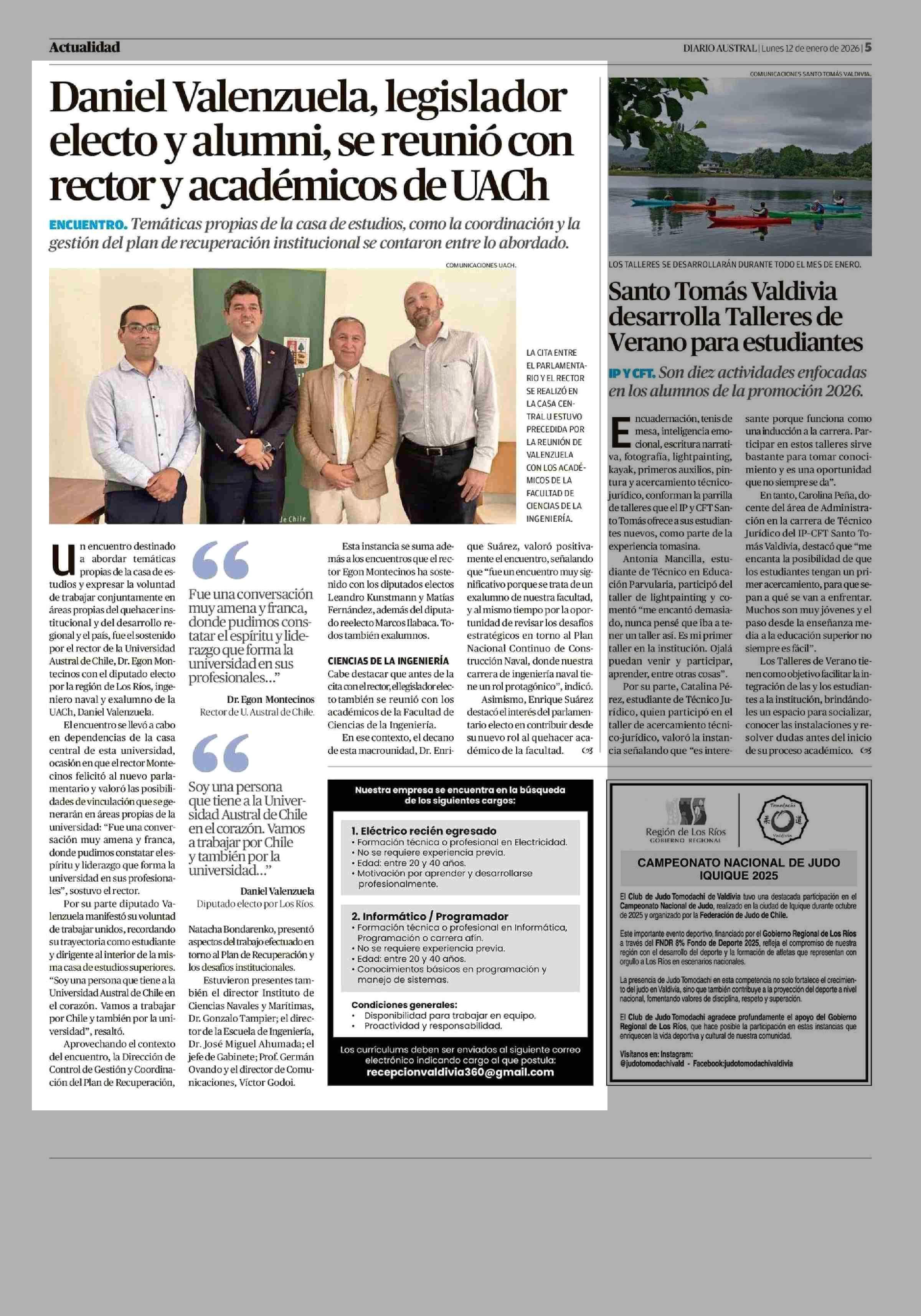 Daniel Valenzuela, legislador electo y alumni, se reunió con rector y académicos de UACh 12-01-2026 Diario Austral Región de Los Ríos |