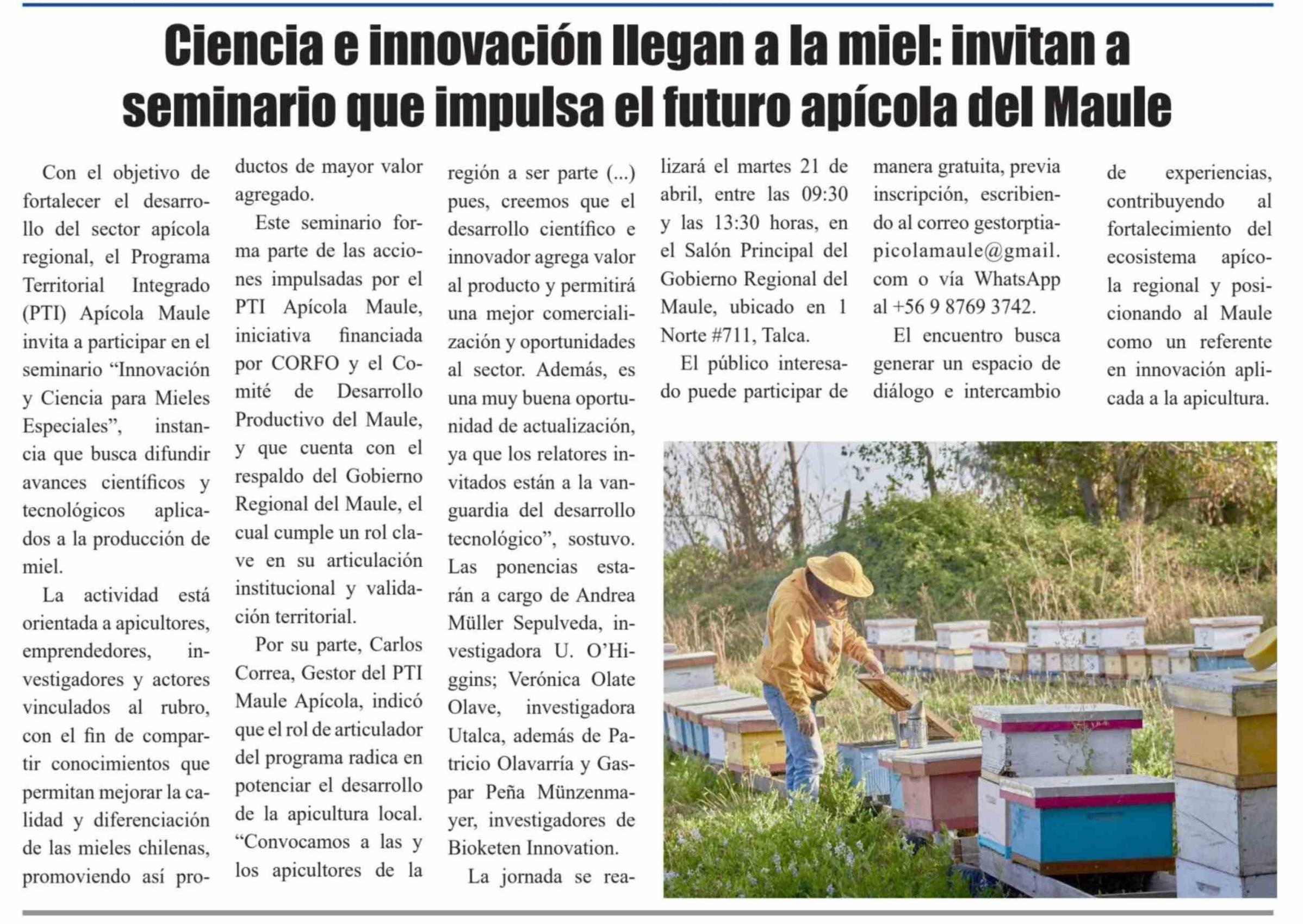Título: Ciencia e innovación llegan a la miel: invitan a seminario que impulsa el futuro apícola del Maule