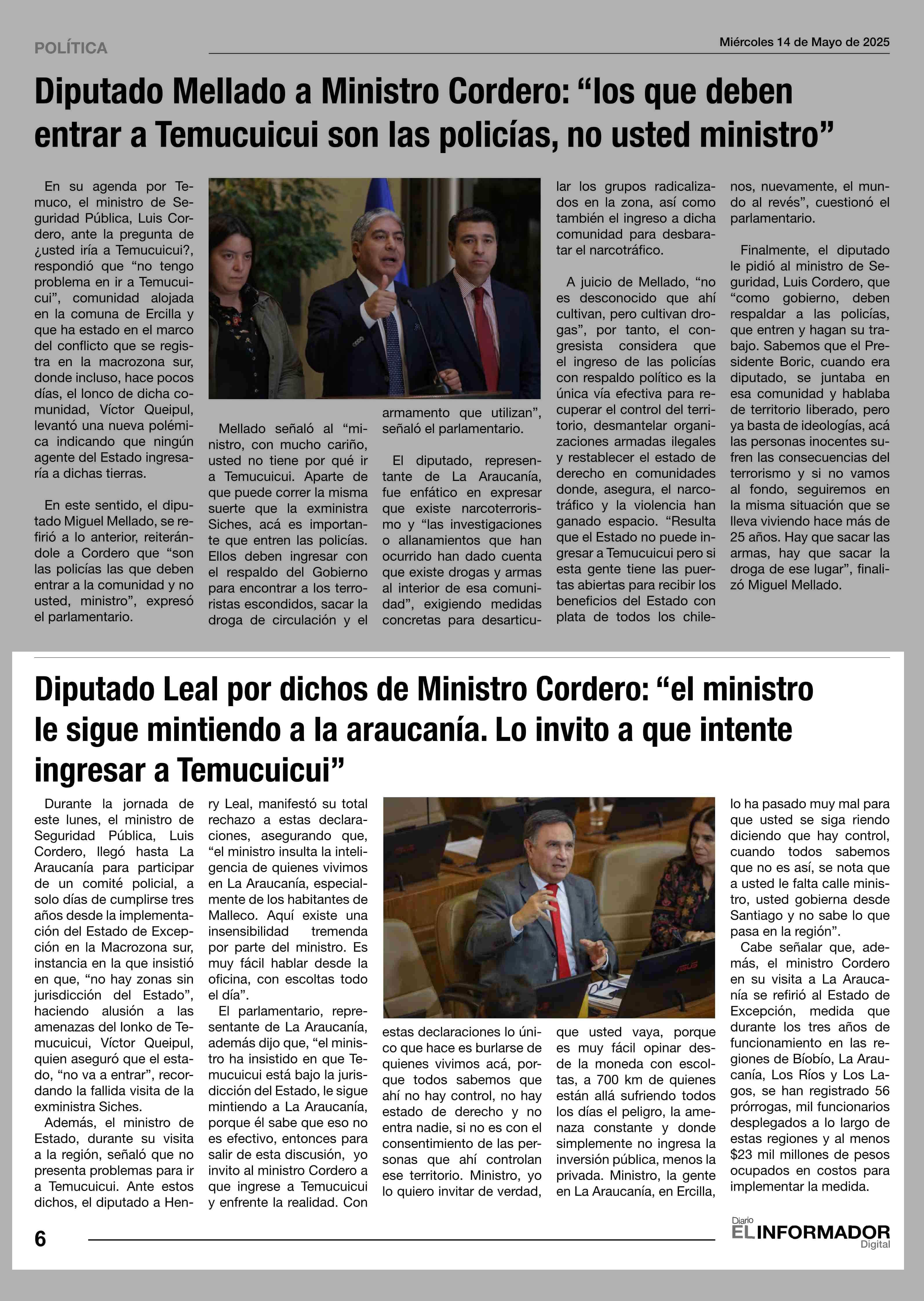 Diputado Leal por dichos de Ministro Cordero: “el ministro le sigue mintiendo a la araucanía. Lo invito a que intente ingresar a Temucuicui” 14-05-2025 El Informador |