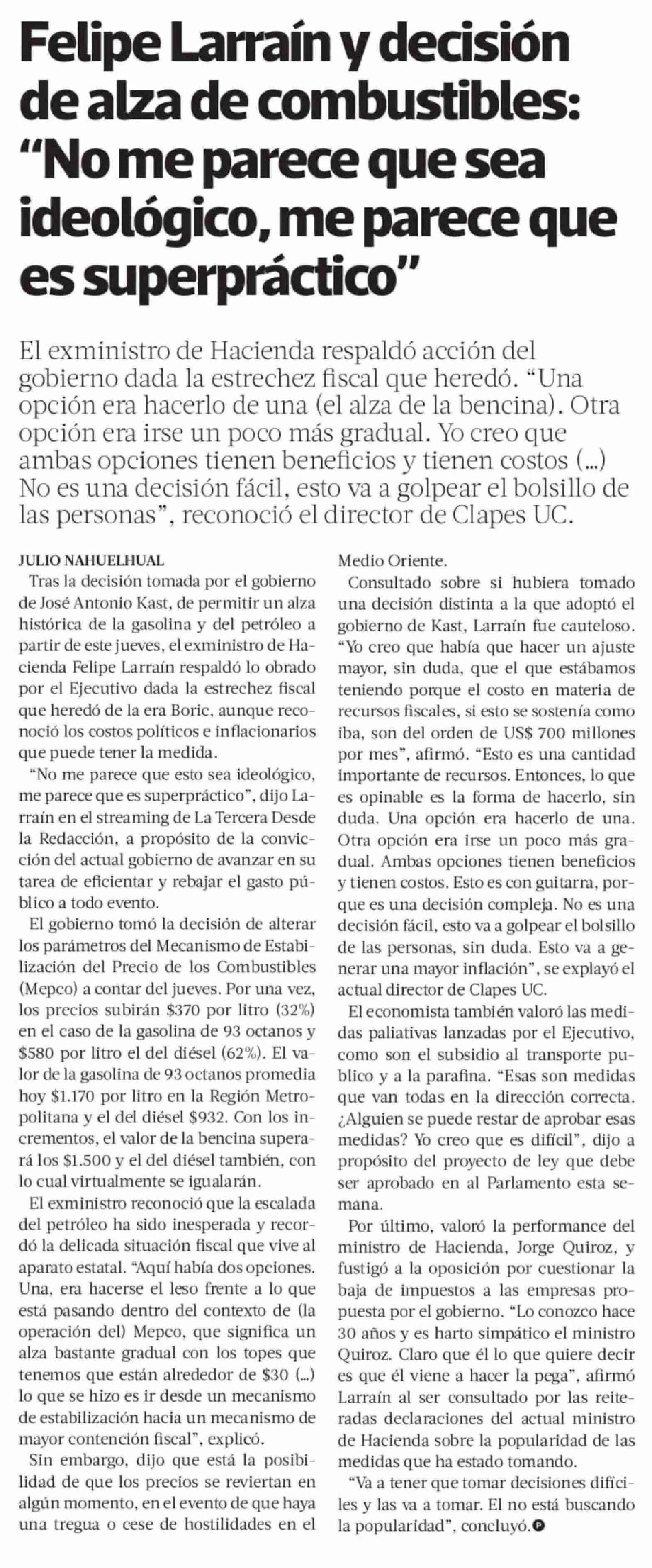 Título: Felipe Larraín y decisión de alza de combustibles: "No me parece que sea ideológico, me parece que es superpráctico"