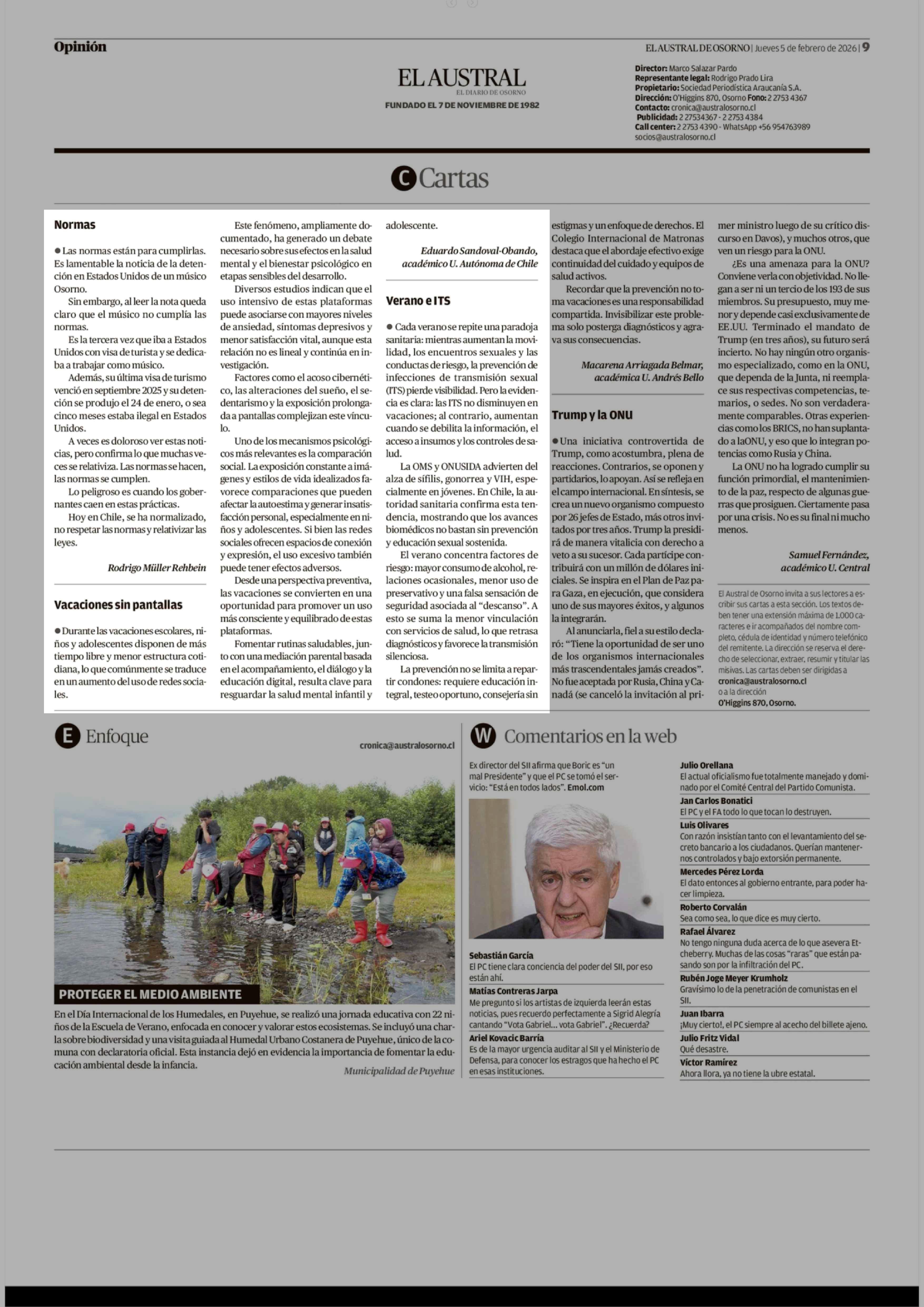 Cartas: Vacaciones sin pantallas 05-02-2026 El Austral de Osorno |