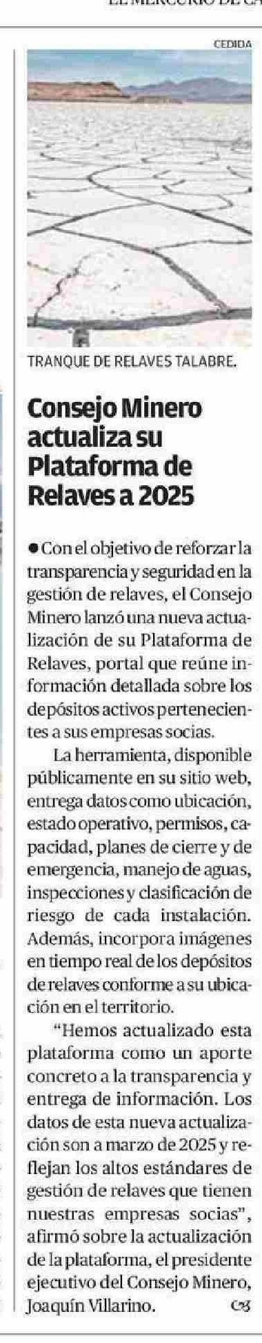 Consejo Minero actualiza su Plataforma de Relavesa 2025 17-05-2025 El Mercurio de Calama |