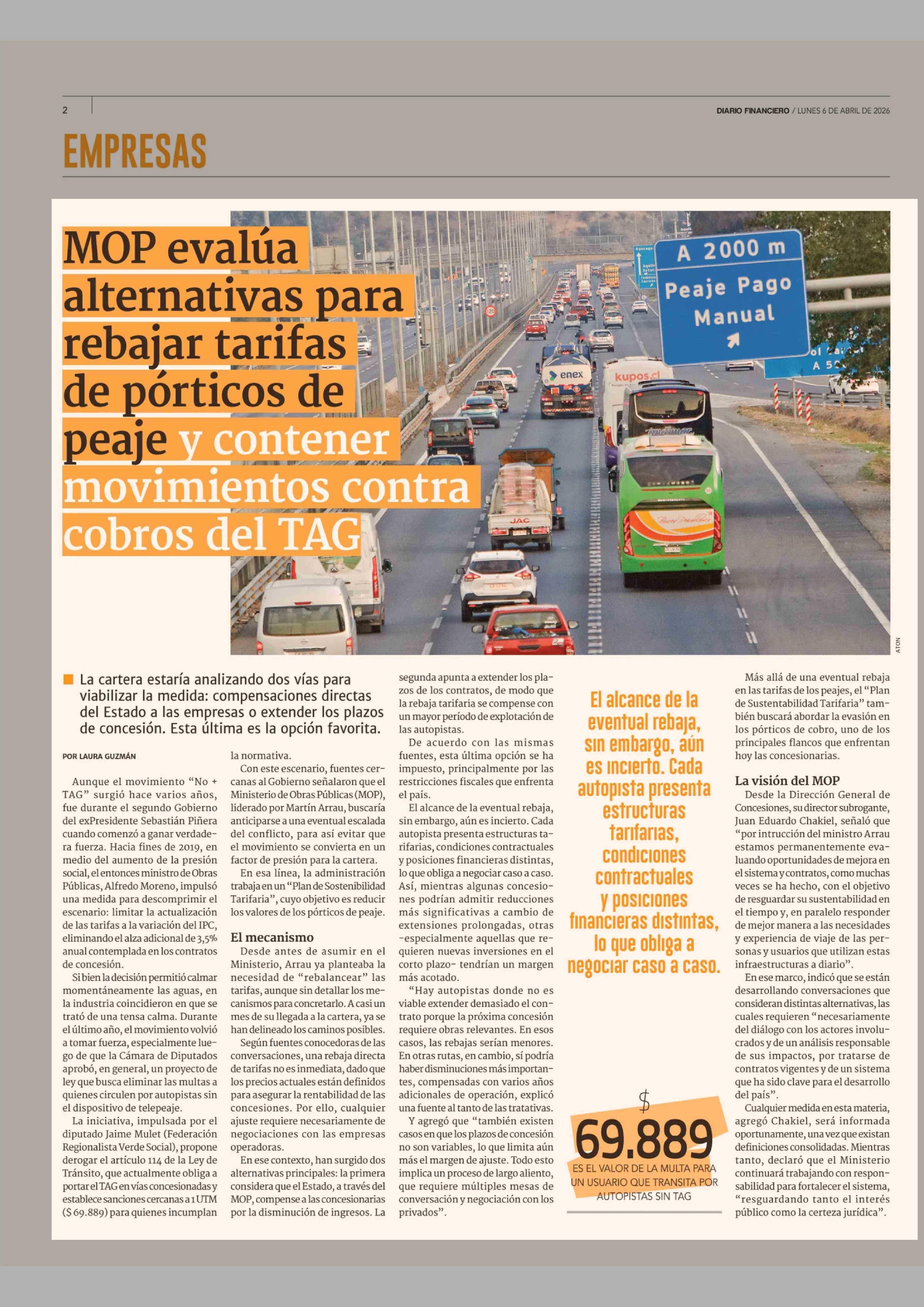 MOP evalúa alternativas para rebajar tarifas de pórticos de peaje y contener movimientos contra cobros del TAG 06-04-2026 Diario Financiero |