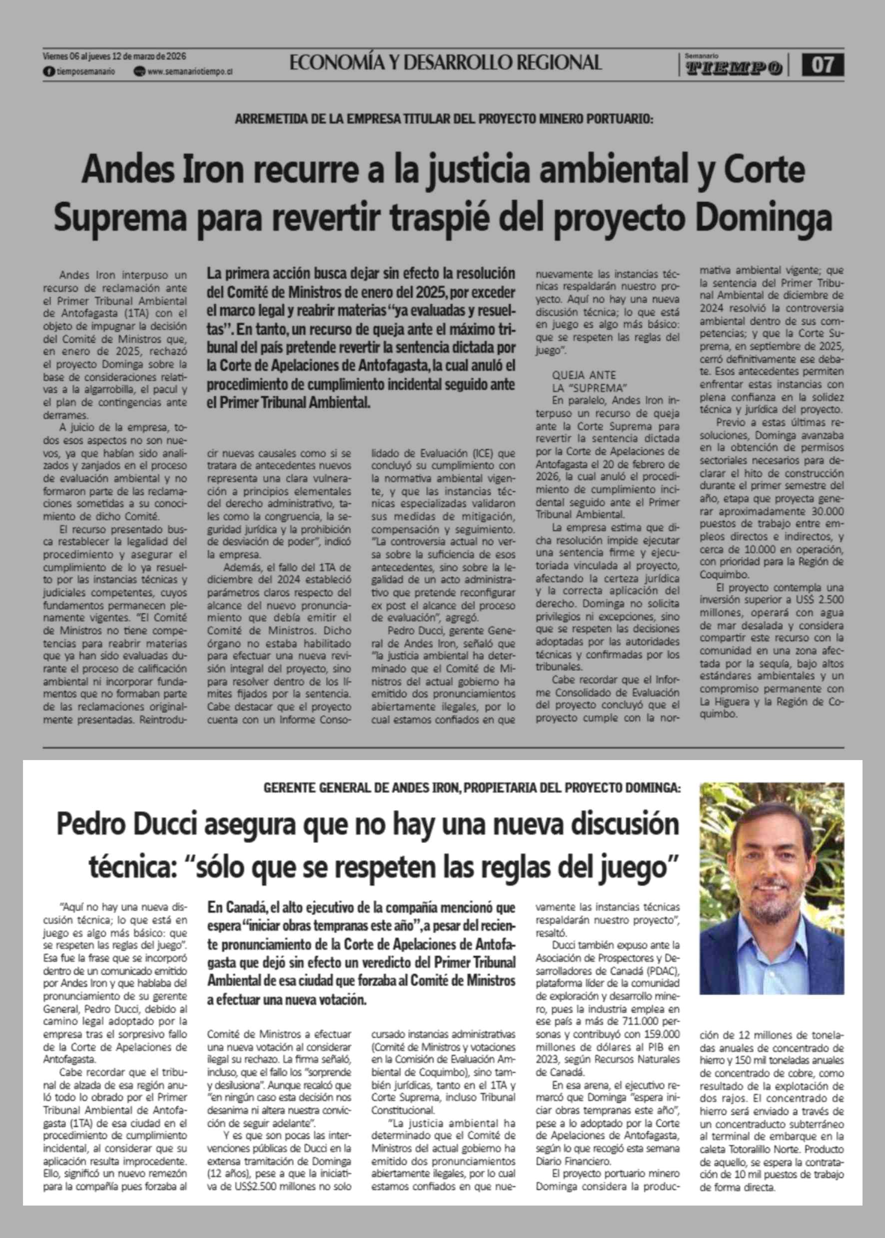 Pedro Ducci asegura que no hay una nueva discusión técnica: "sólo que se respeten las reglas del juego" 06-03-2026 Semanario Tiempo |