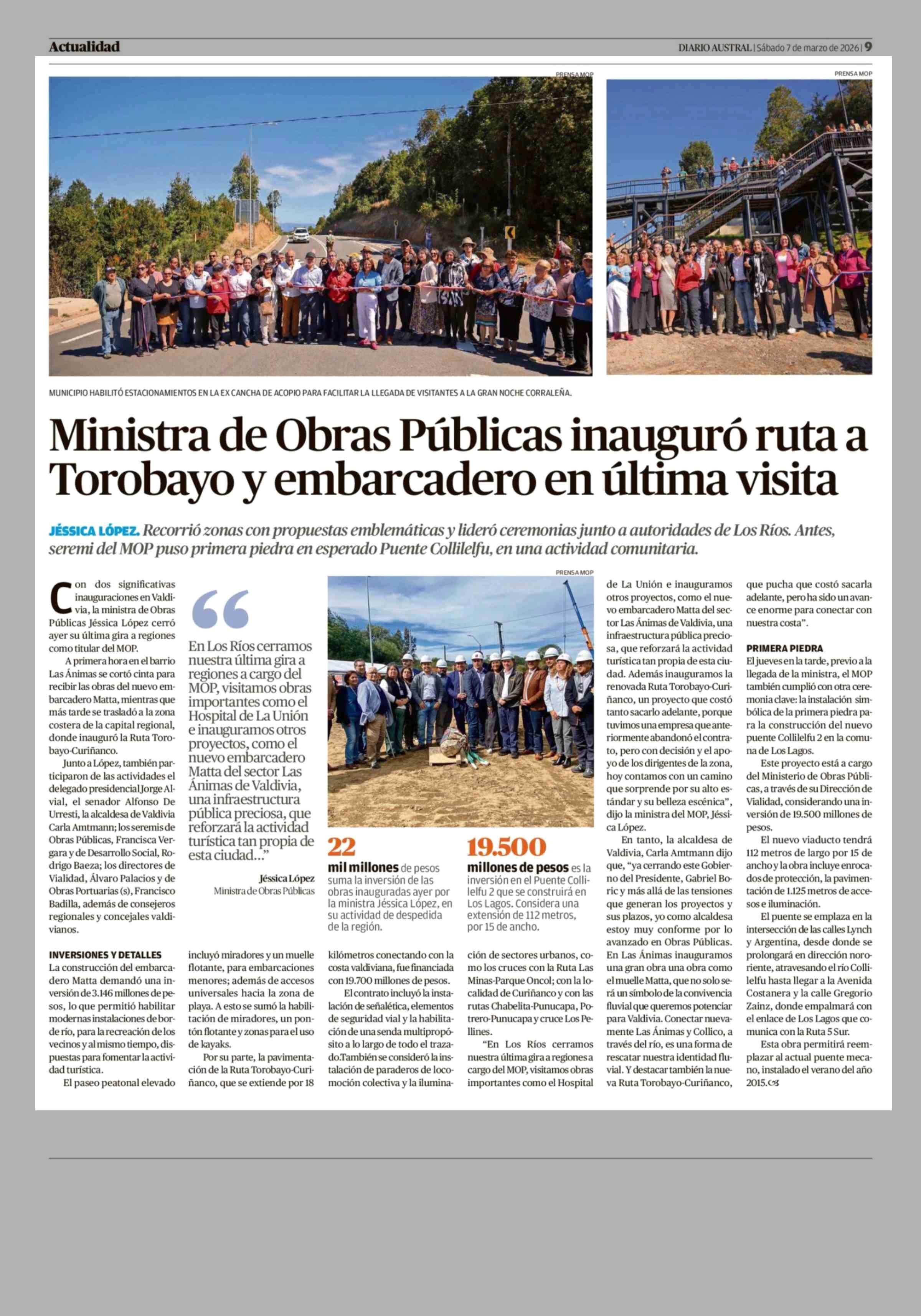 Ministra de Obras Públicas inauguró ruta a Torobayo y embarcadero en última visita 07-03-2026 Diario Austral Región de Los Ríos |