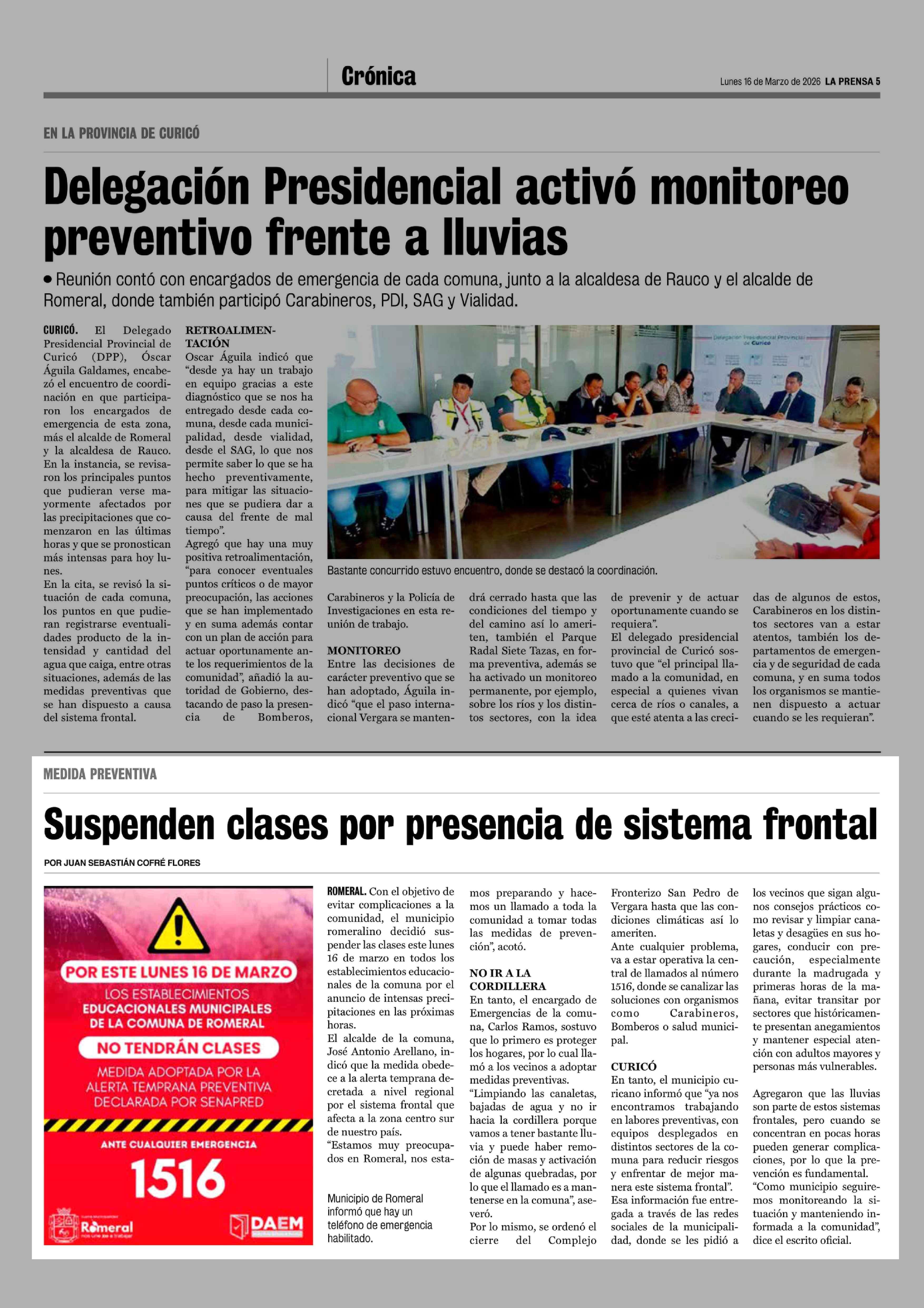 Suspenden clases por presencia de sistema frontal 16-03-2026 La Prensa de Curicó |