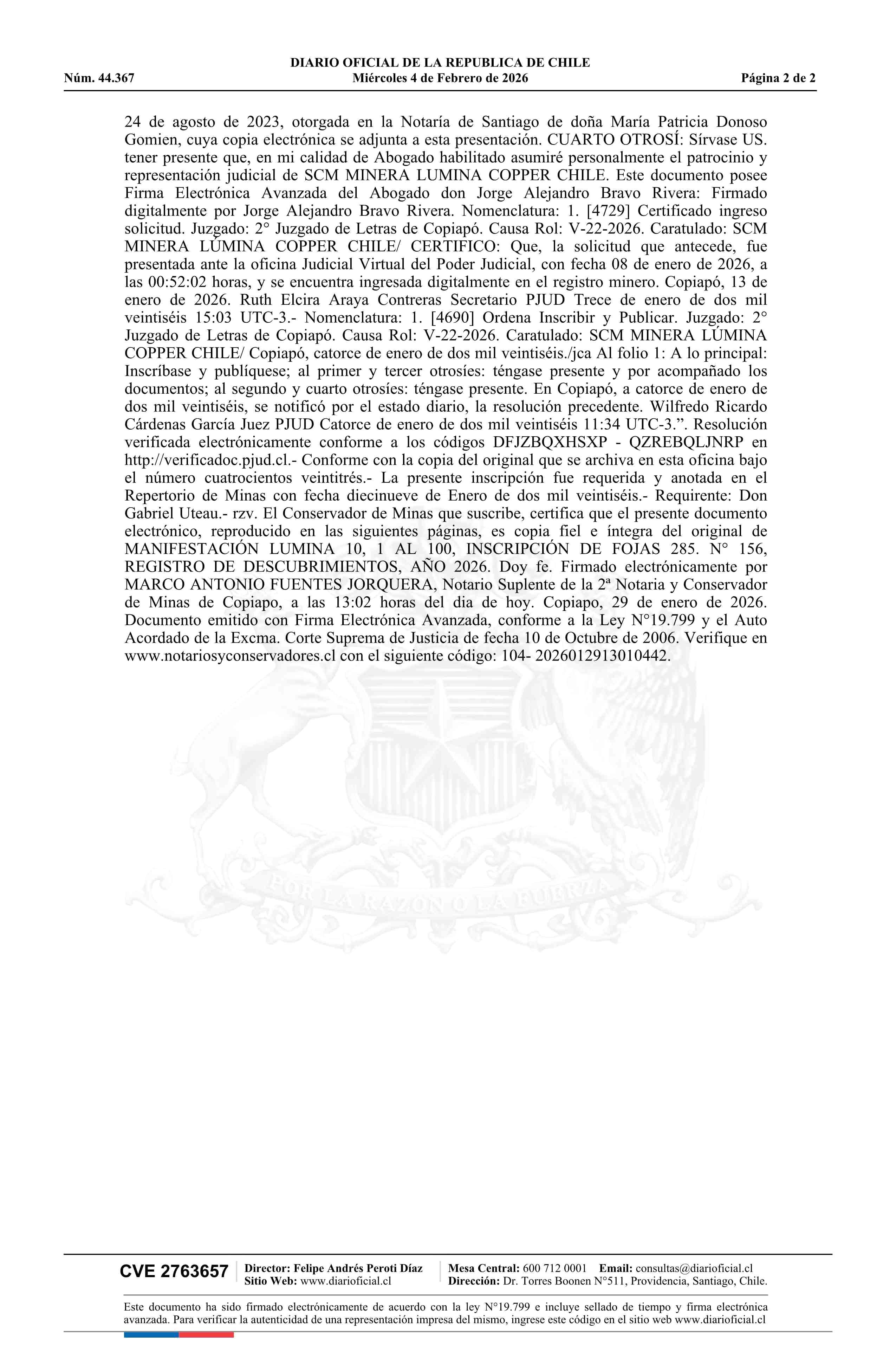 LUMINA 10, 1 AL 100 / SCM Minera Lumina Copper Chile 04-02-2026 DIARIO OFICIAL CHILE - BOLETÍN OFICIAL DE MINERÍA |