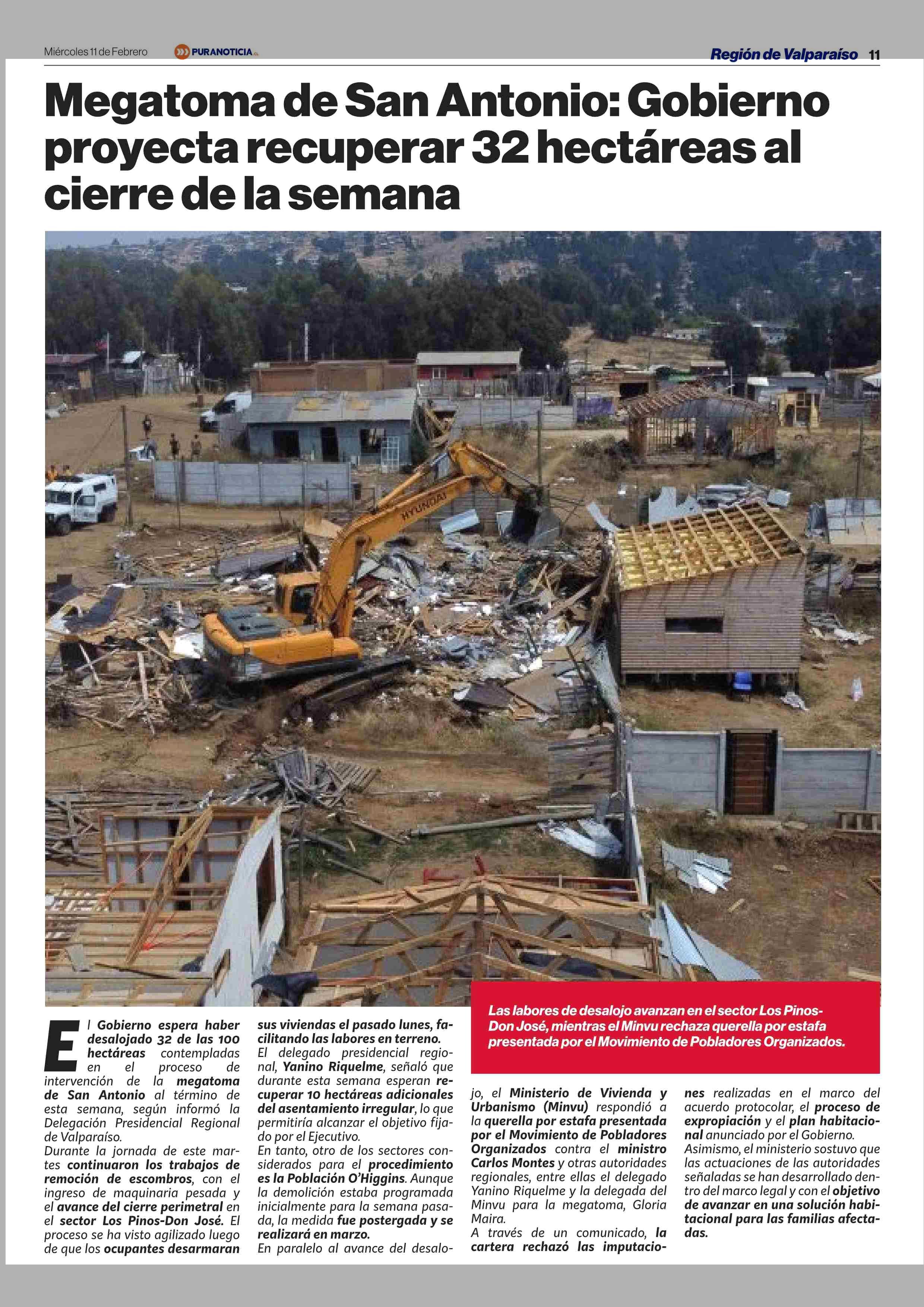| Título: | Megatoma de San Antonio: Gobierno proyecta recuperar 32 hectáreas al cierre de la semana |
