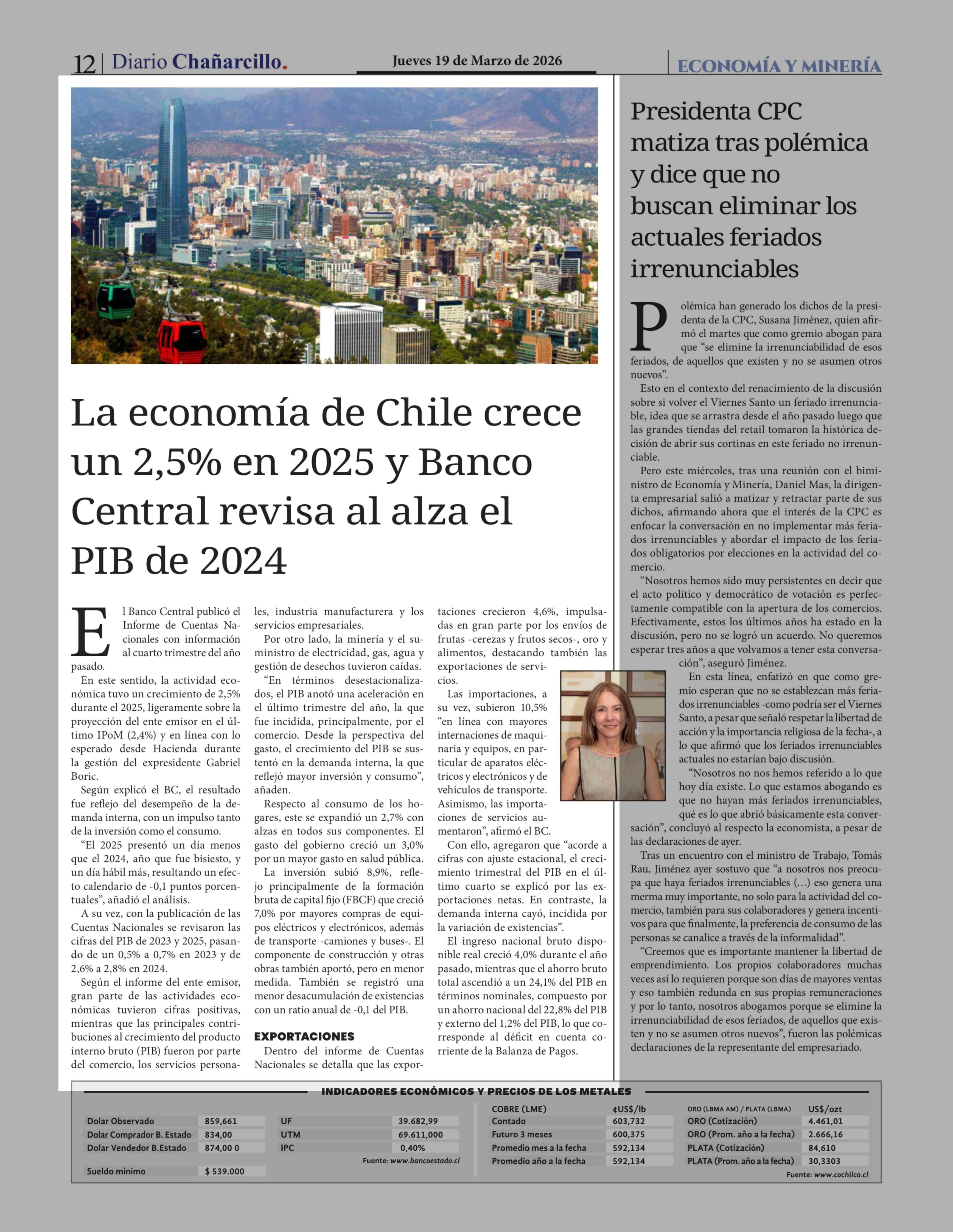 La economía de Chile crece un 2,5% en 2025 y Banco Central revisa al alza el PIB de 2024 19-03-2026 Diario Chañarcillo |
