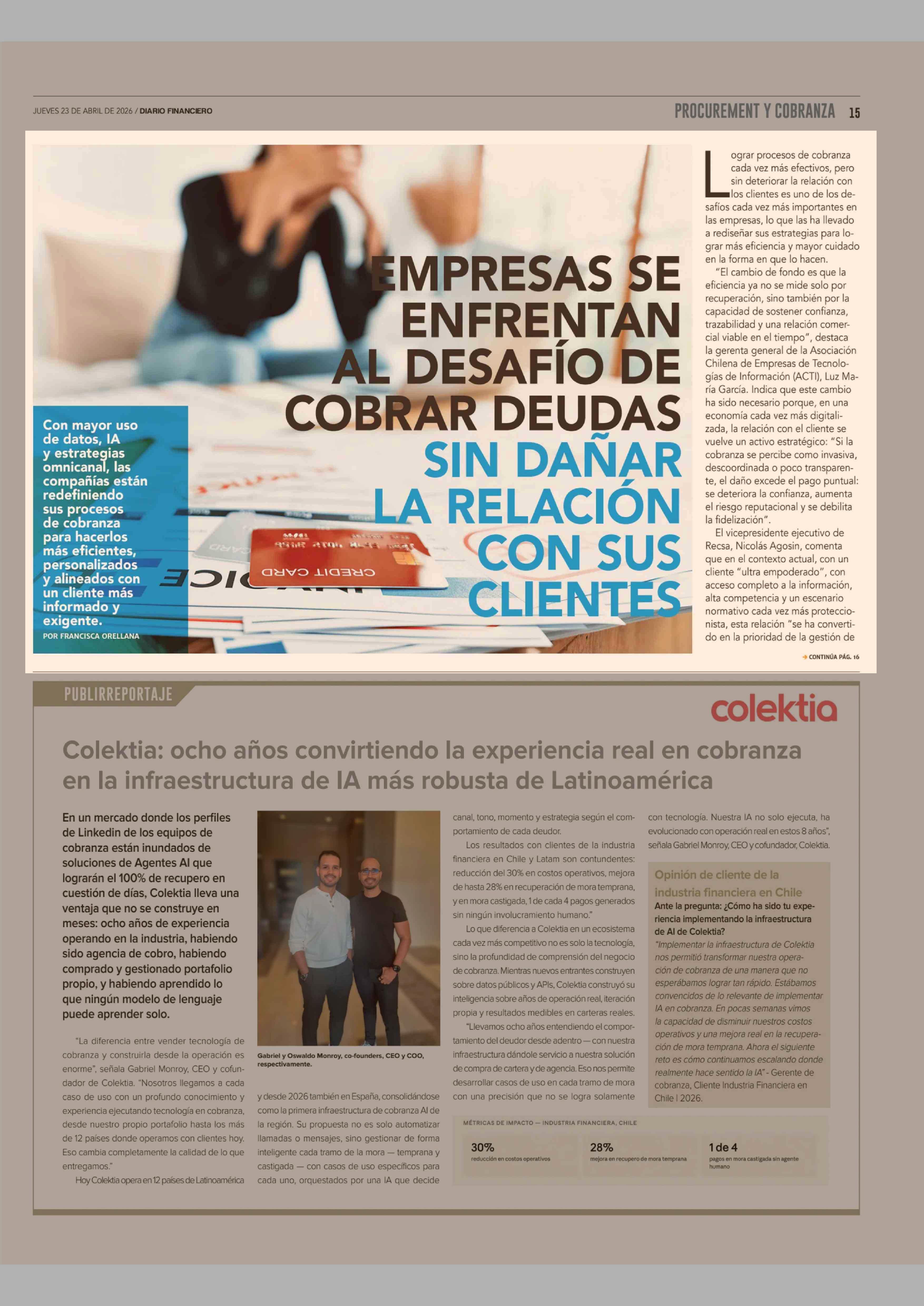 EMPRESAS SE ENFRENTAN AL DESAFÍO DE COBRAR DEUDAS SIN DAÑAR LA RELACIÓN CON SUS CLIENTES 23-04-2026 Diario Financiero |
