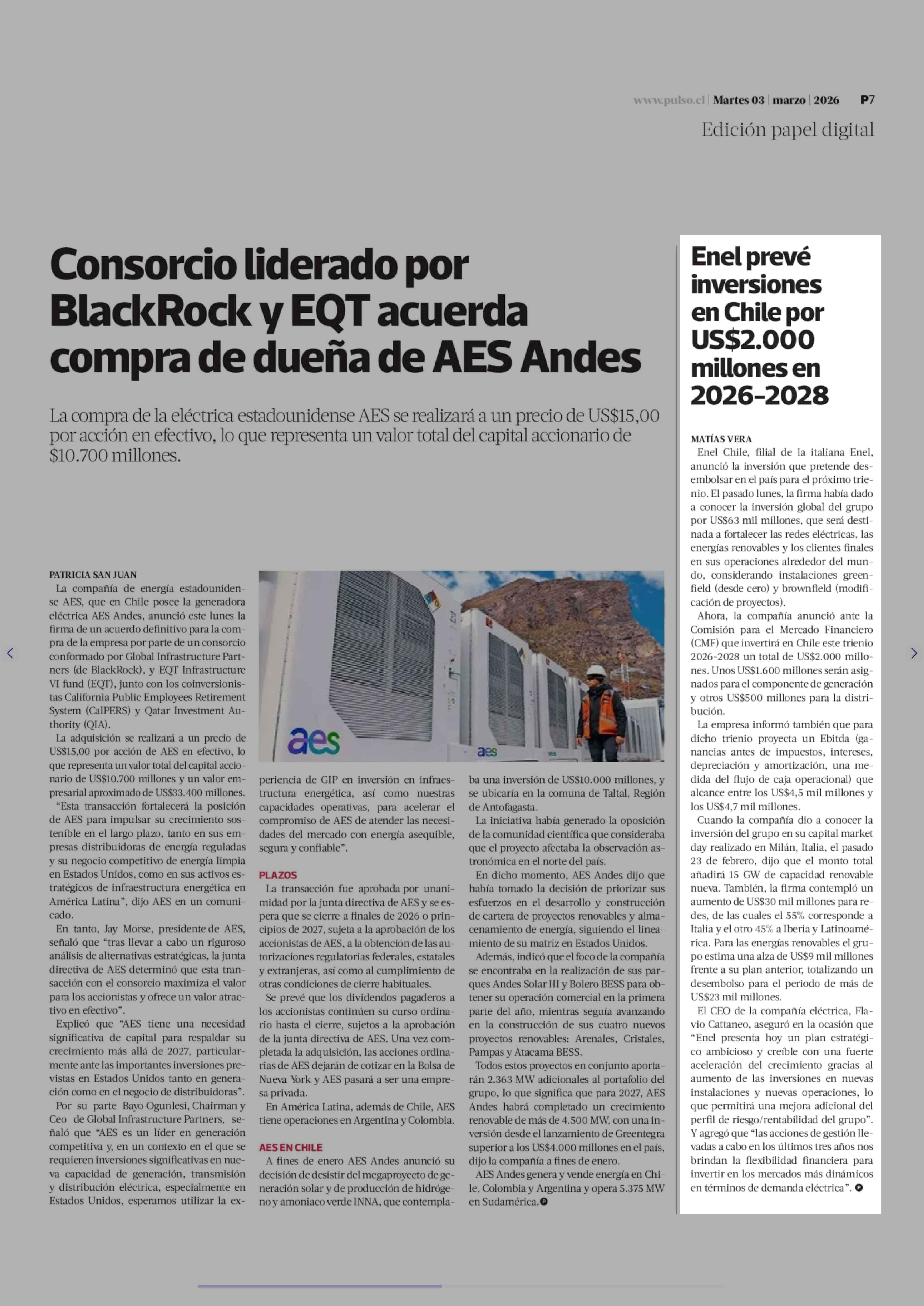 Enel prevé inversiones en Chile por US$2.000 millones en 2026-2028 03-03-2026 La Tercera |