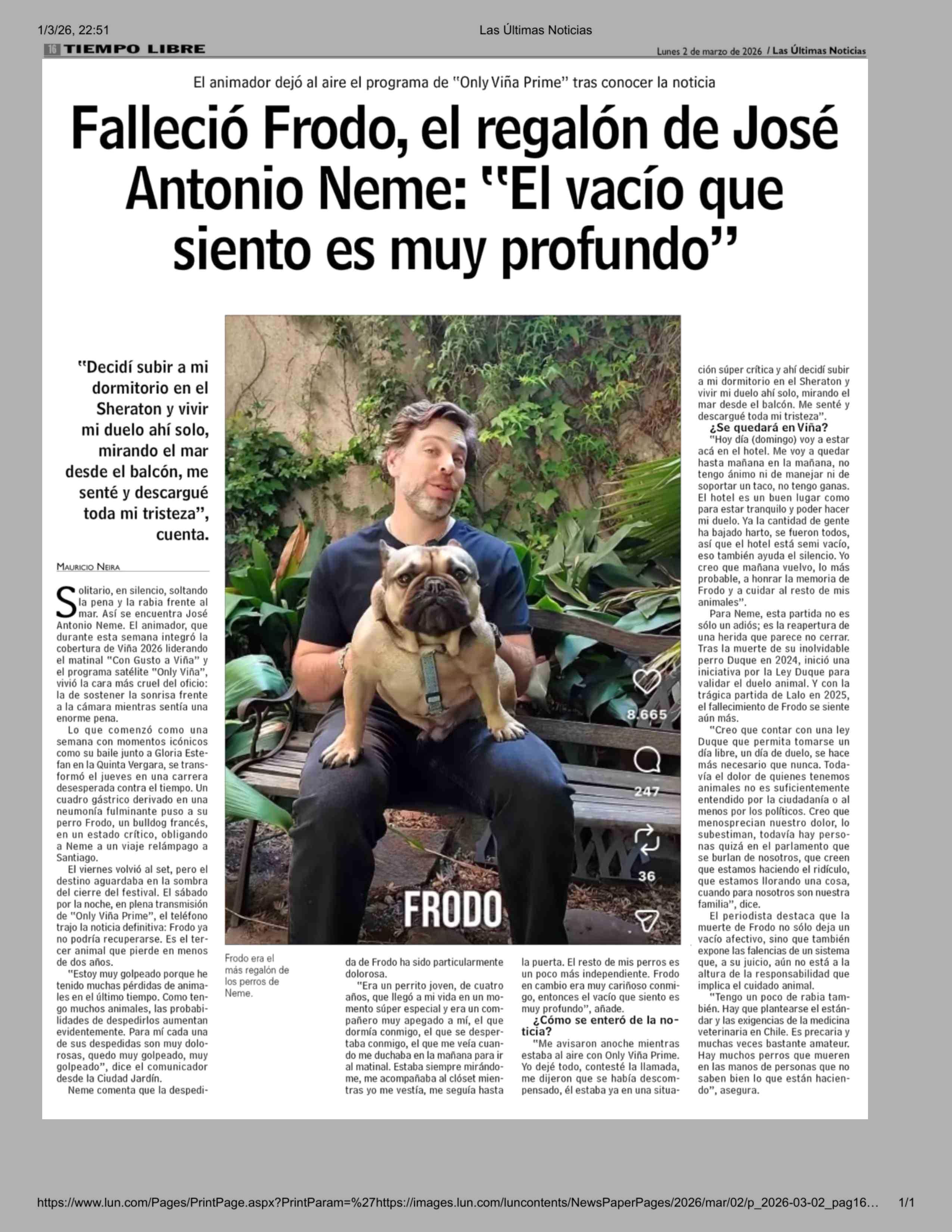 Falleció Frodo, el regalón de José Antonio Neme: "El vacío que siento es muy profundo" 02-03-2026 Las Últimas Noticias |