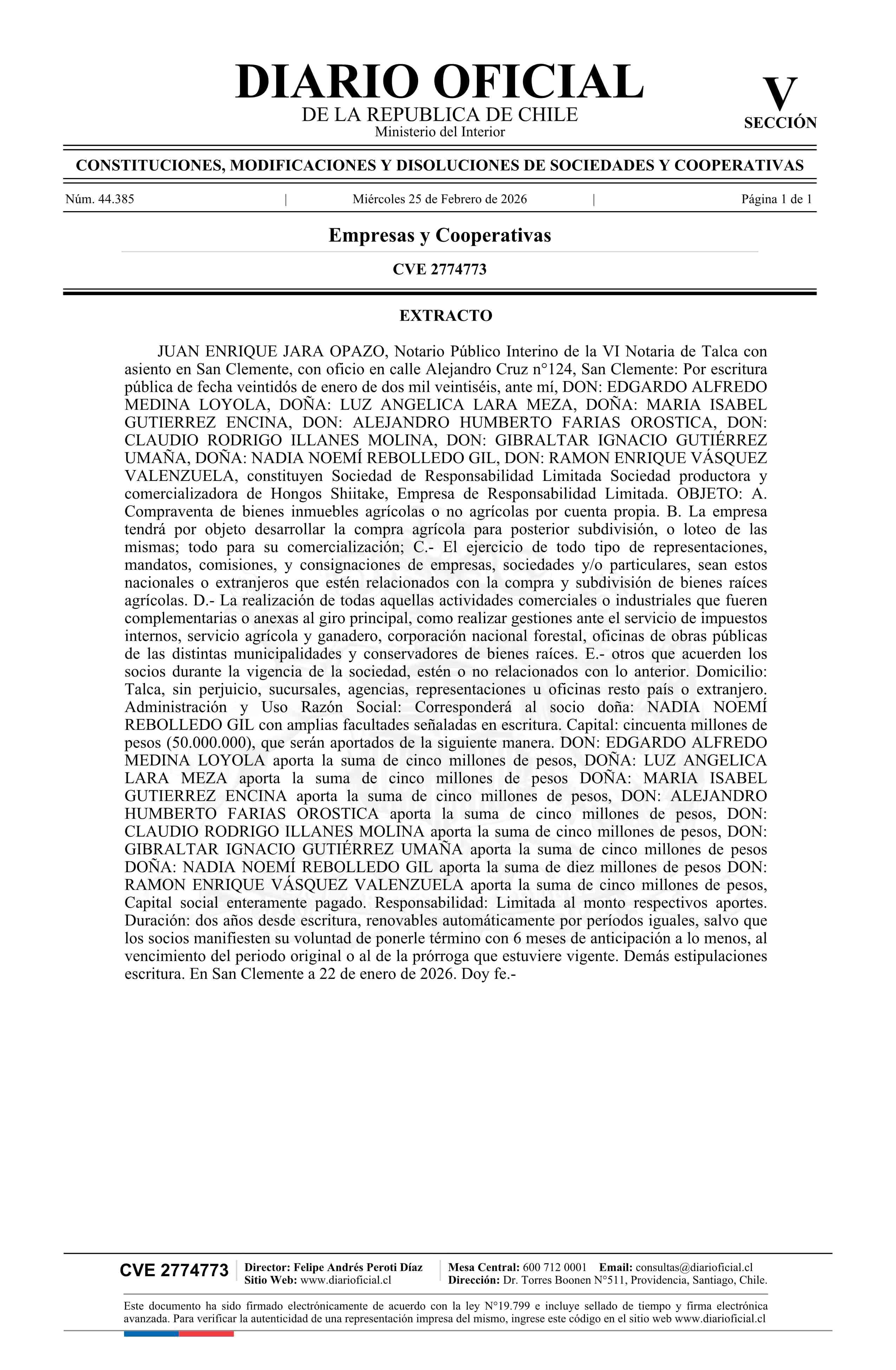 SOCIEDAD PRODUCTORA Y COMERCIALIZADORA DE HONGOS SHIITAKE EMPRESA DE RESPONSABILIDAD LIMITADA 25-02-2026 Diario Oficial Edición Electrónica |