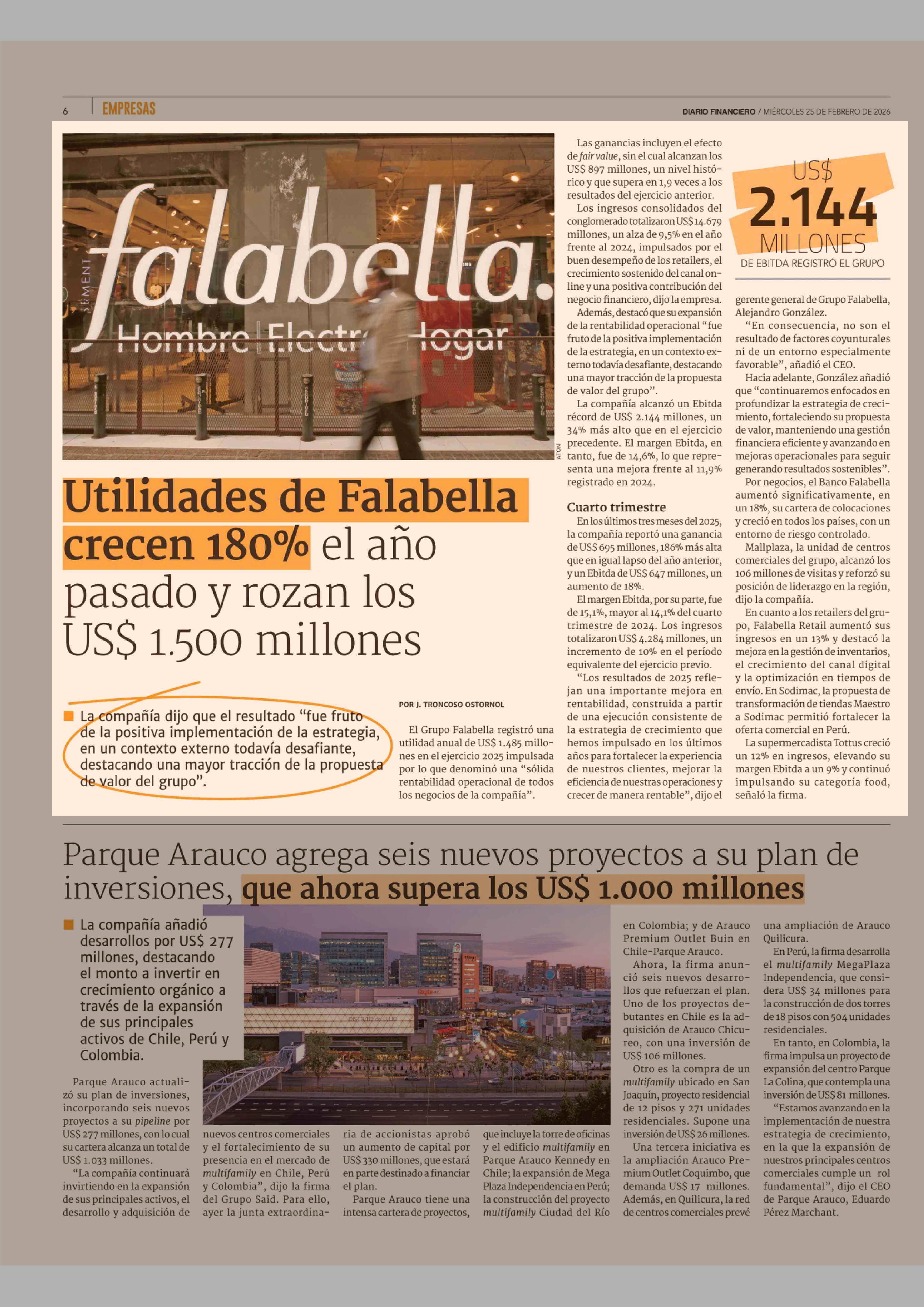 Utilidades de Falabella crecen 180% el año pasado y rozan los US$ 1.500 millones 25-02-2026 Diario Financiero |