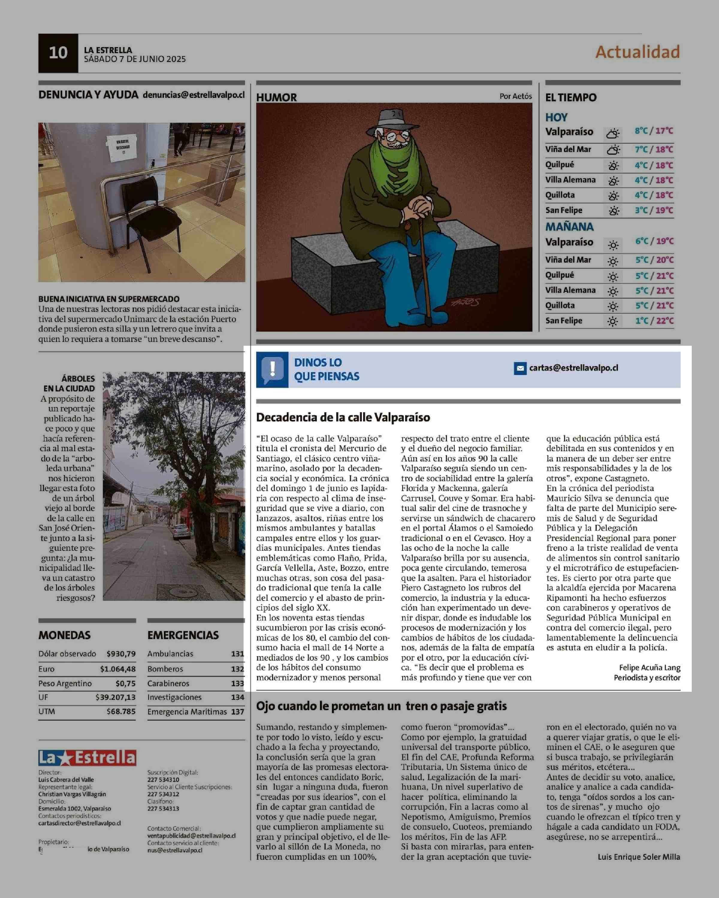 Cartas: Decadencia de la calle Valparaíso 07-06-2025 La Estrella de Valparaíso |
