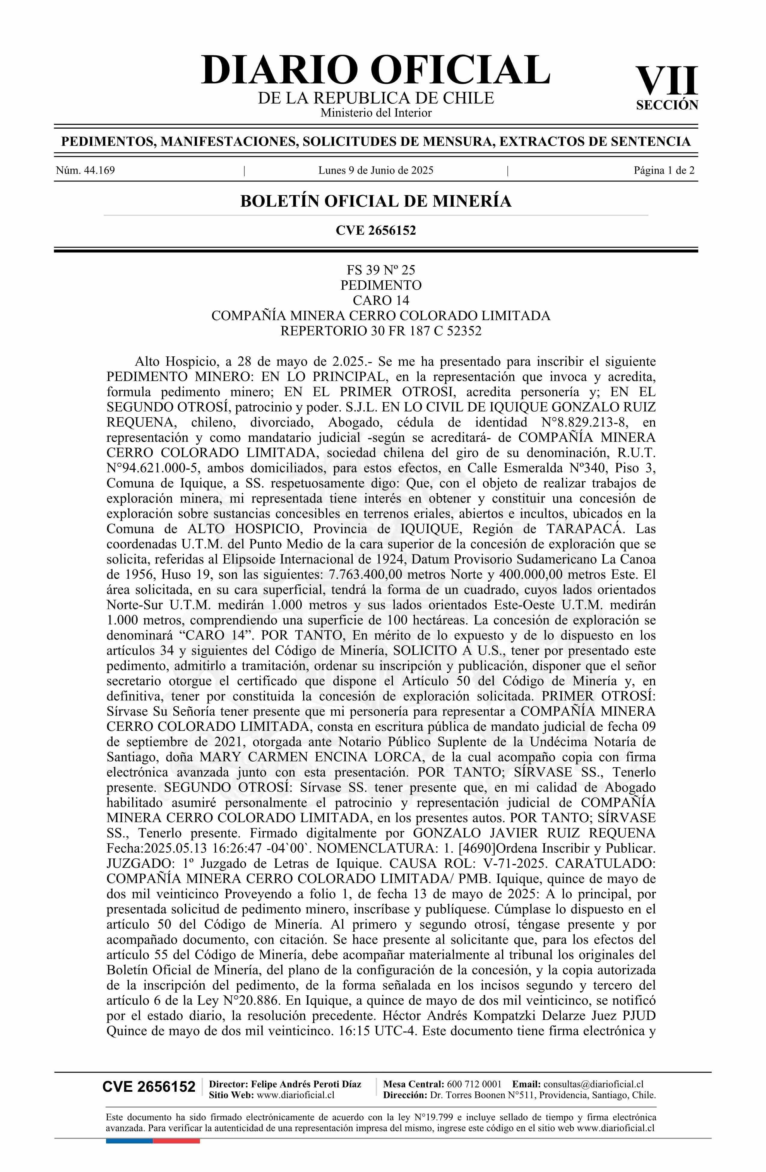 CARO 14 / Compañía Minera Cerro Colorado Limitada 09-06-2025 DIARIO OFICIAL CHILE - BOLETÍN OFICIAL DE MINERÍA |