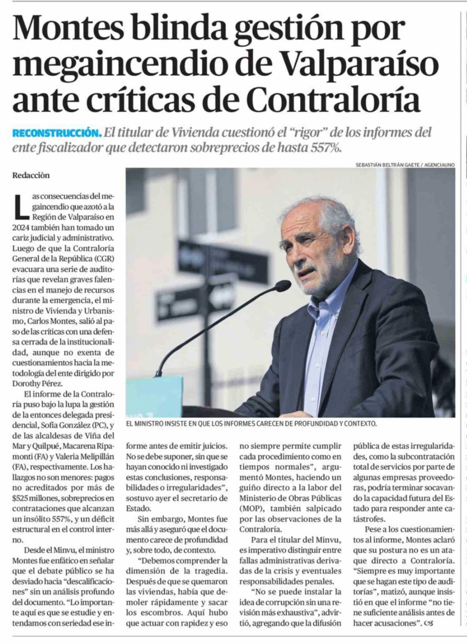 Montes blinda gestión por megaincendio de Valparaíso ante críticas de Contraloría 15-02-2026 El Diario de Atacama |