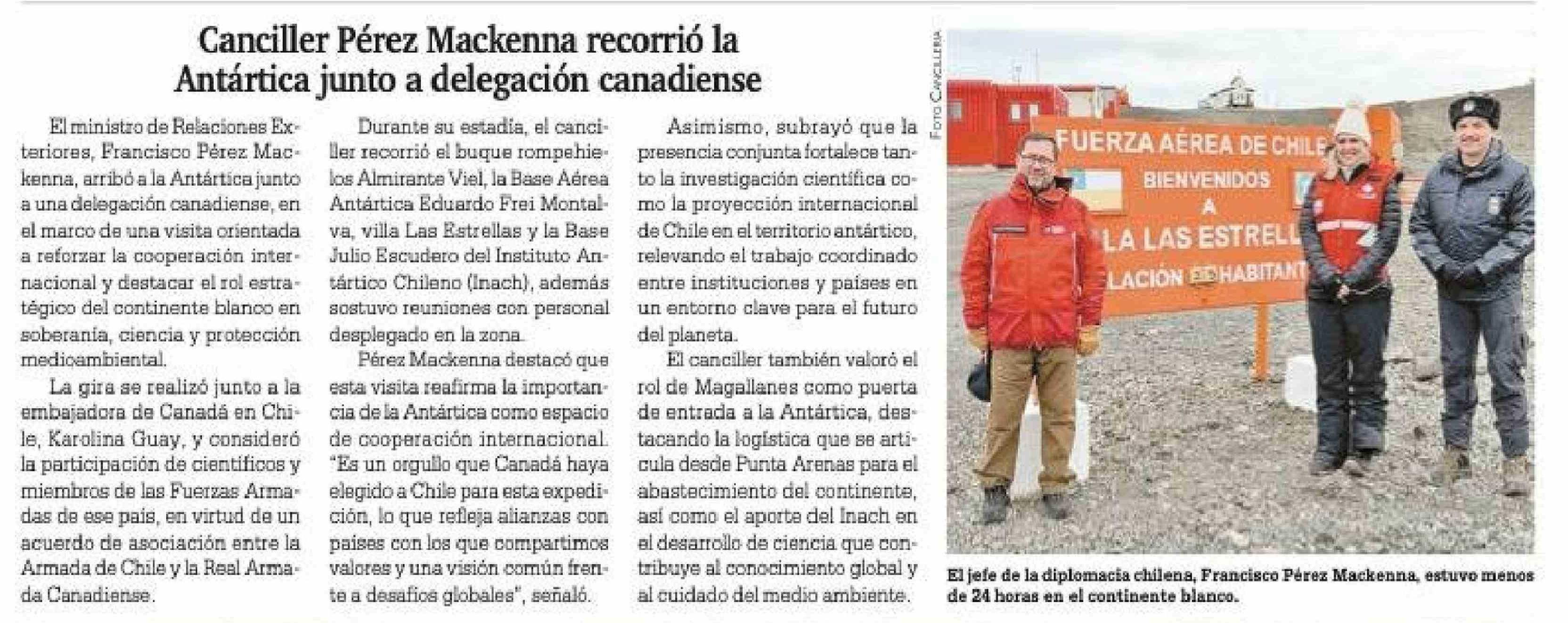 Canciller Pérez Mackenna recorrió la Antártica junto a delegación canadiense 20-03-2026 La Prensa Austral |