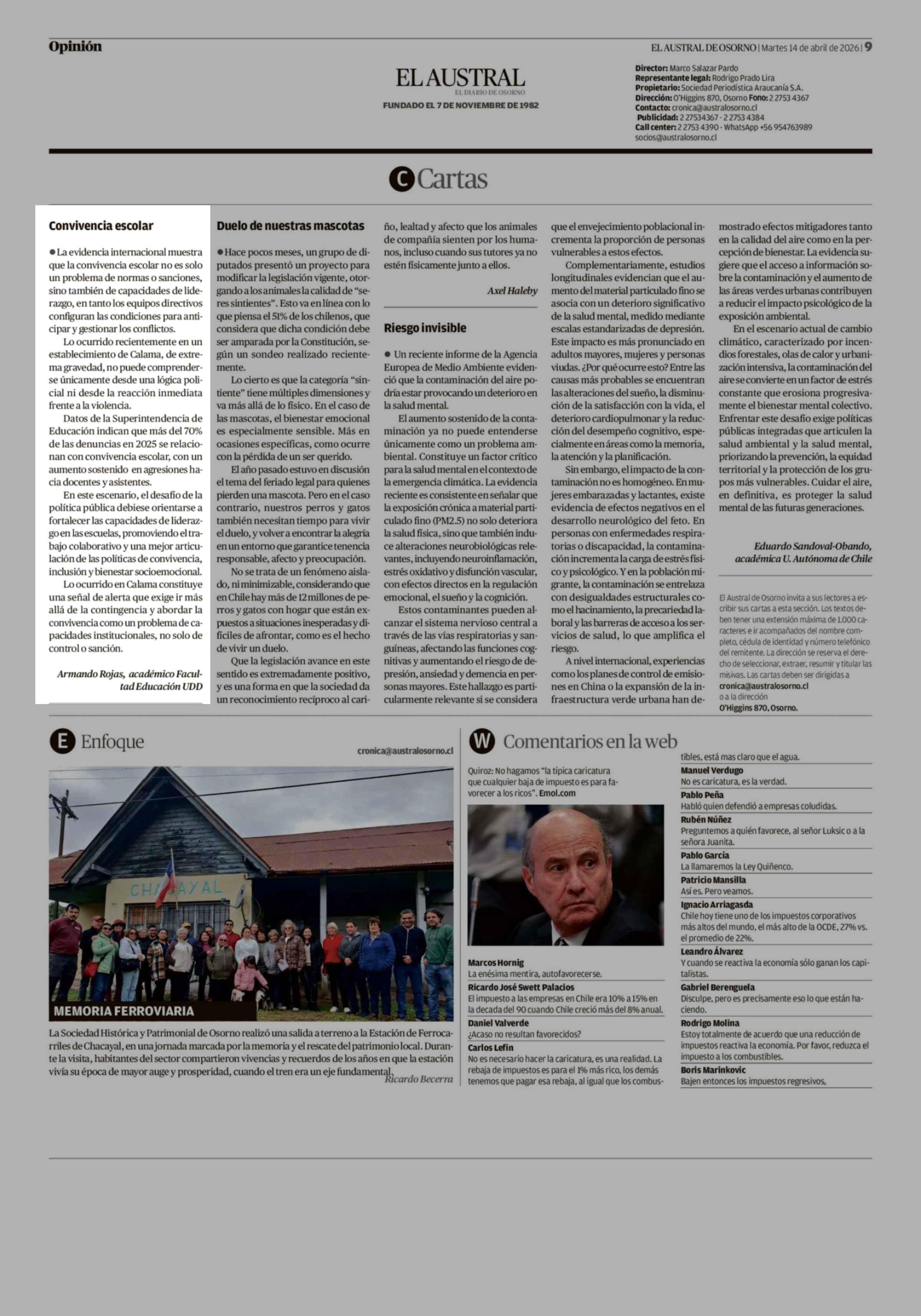 Cartas: Convivencia escolar 14-04-2026 El Austral de Osorno |