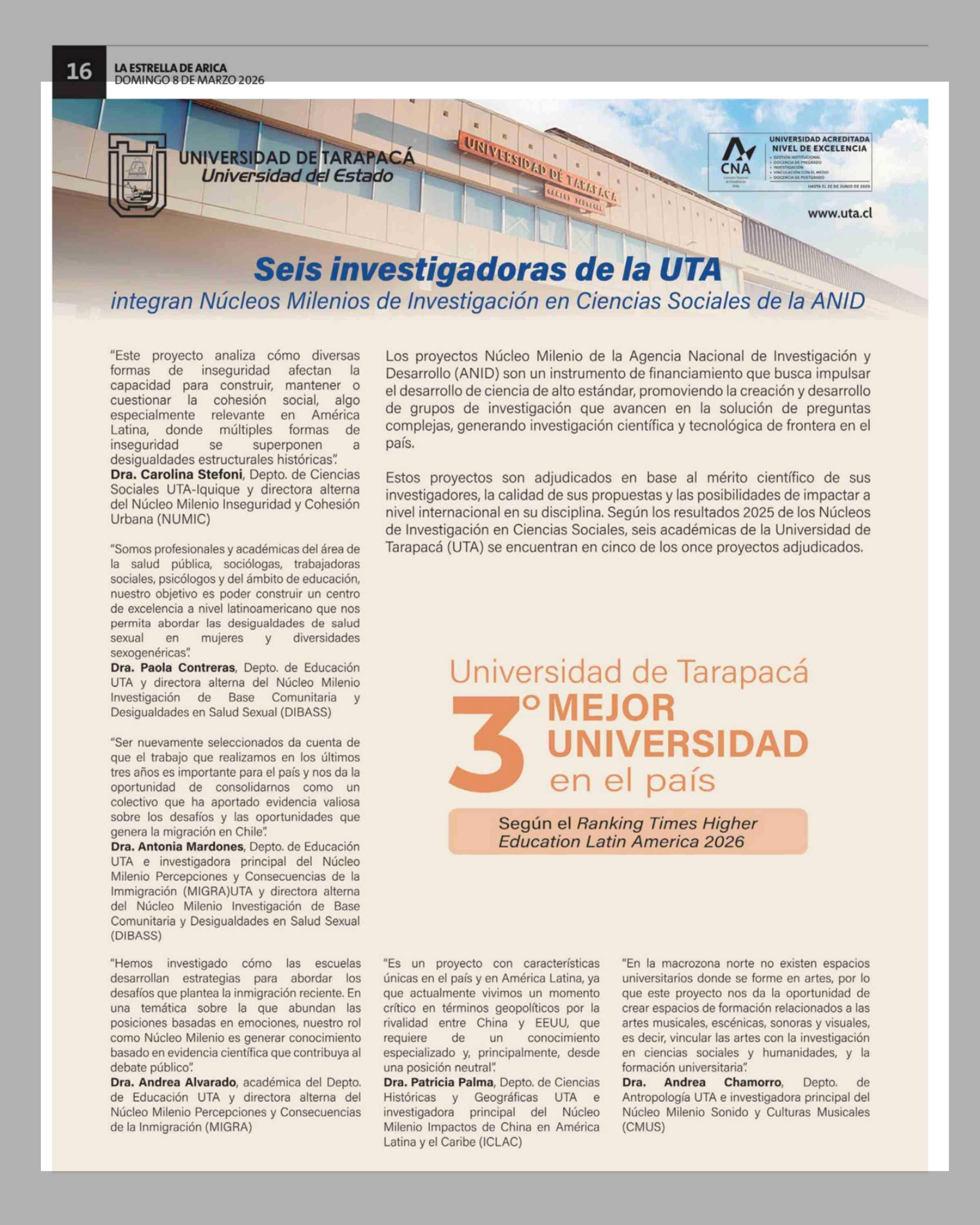 Universidad de Tarapacá · MEJOR 3 UNIVERSIDAD en el país Según el Ranking Times Higher Education Latin America 2026 08-03-2026 La Estrella de Arica |