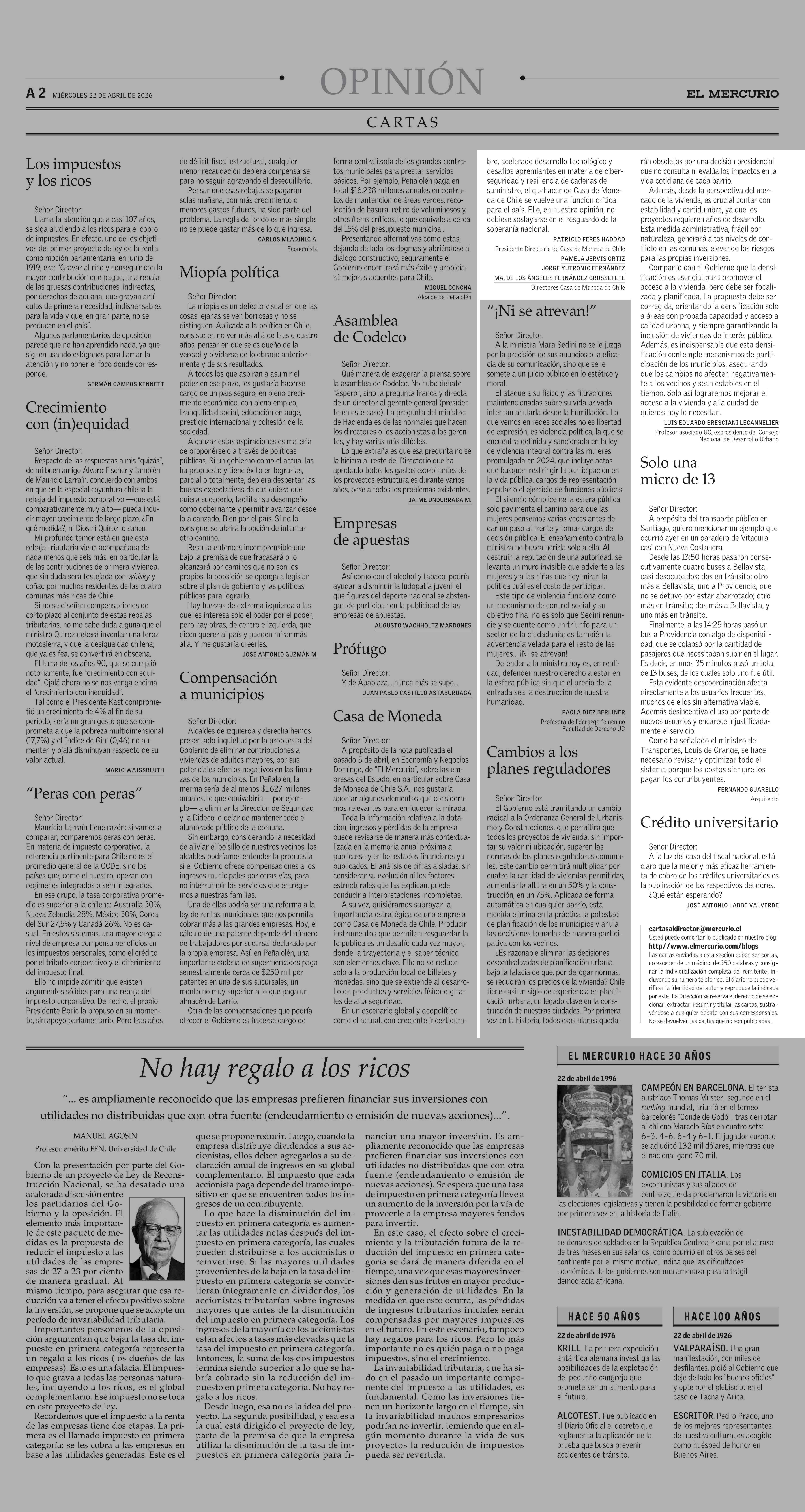 CARTAS: Cambios a los planes reguladores 22-04-2026 El Mercurio |