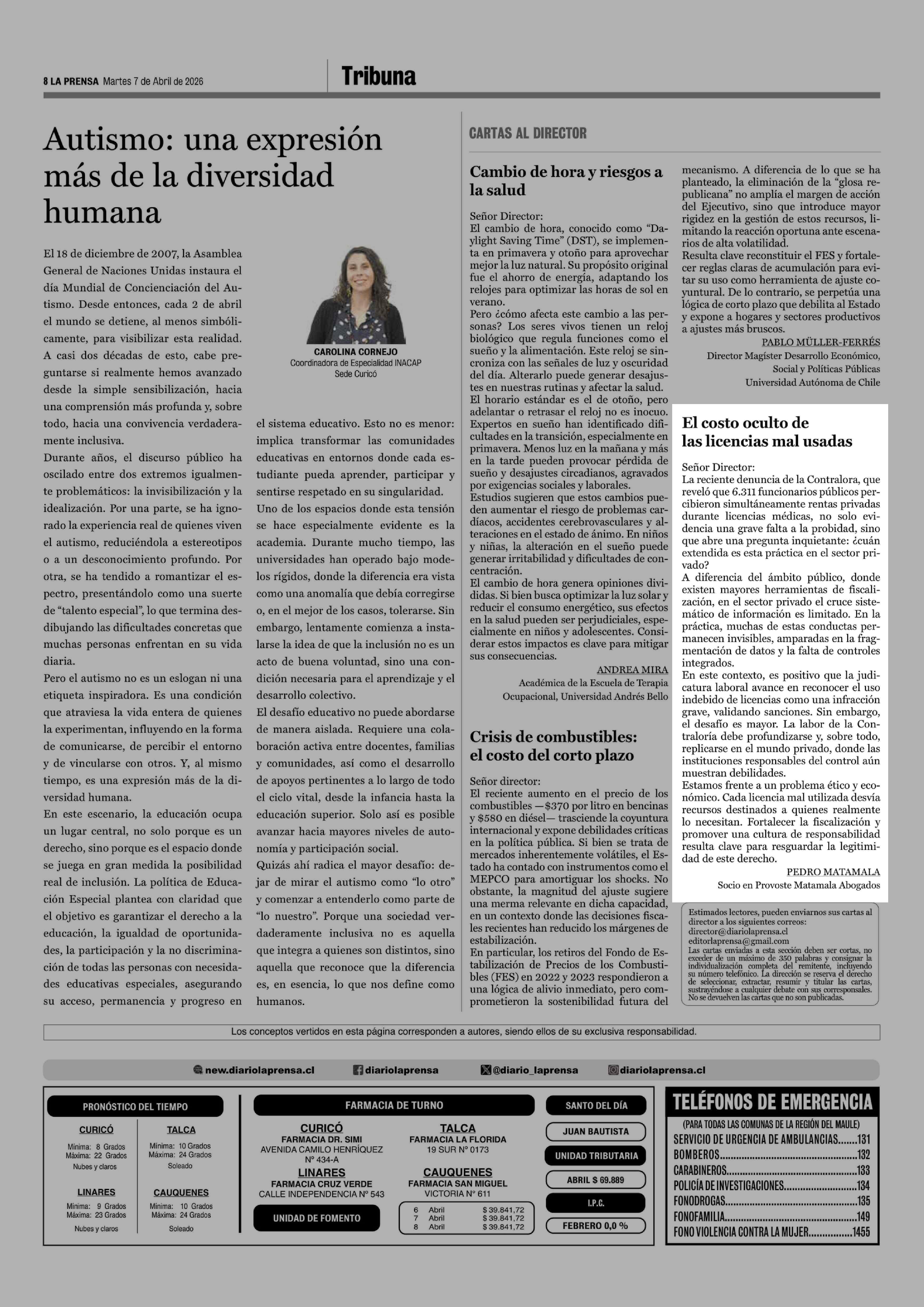 Cartas: El costo oculto de las licencias mal usadas 07-04-2026 La Prensa de Curicó |