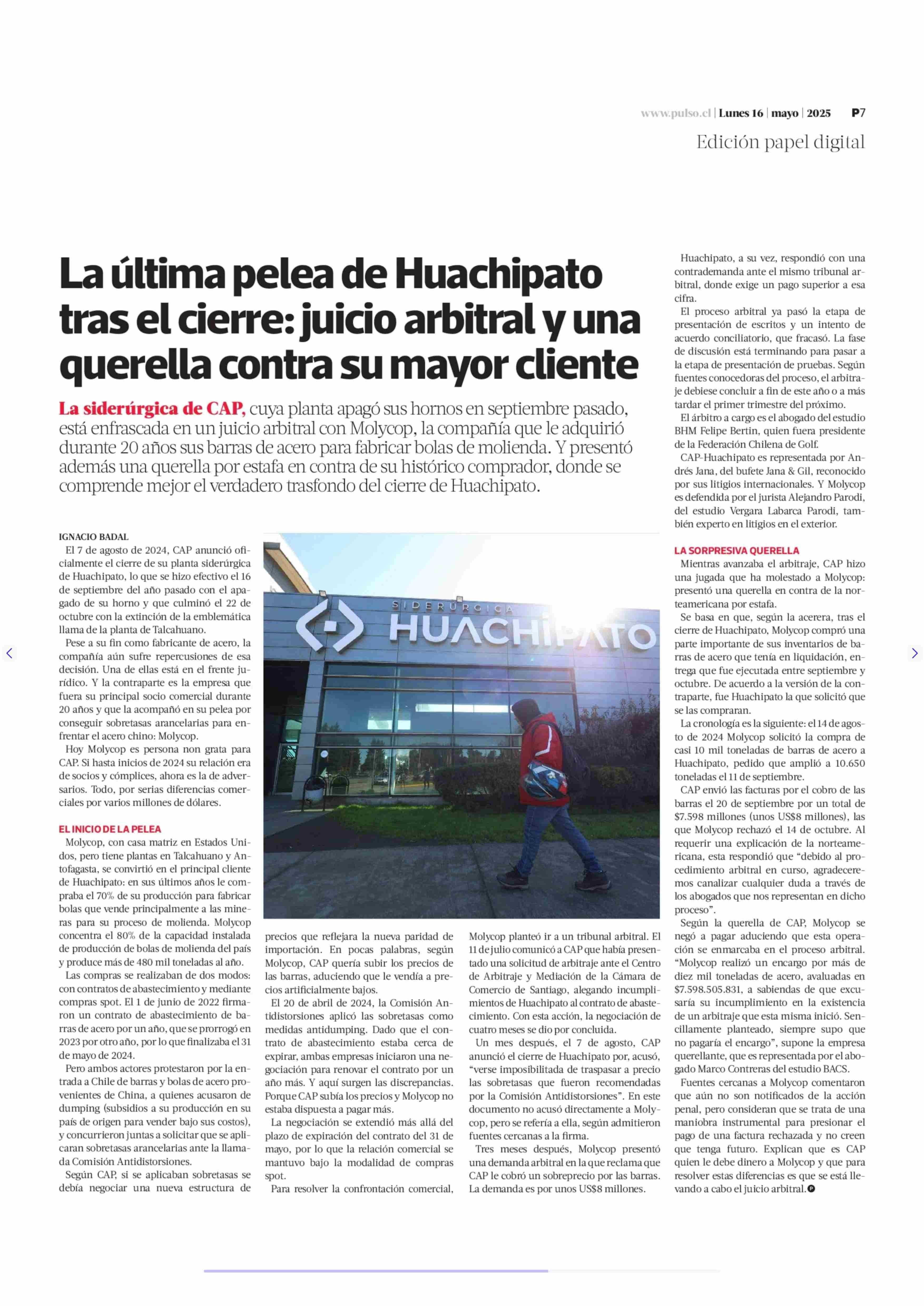 La última pelea de Huachipato tras el cierre: juicio arbitral y una querella contra su mayor cliente 16-06-2025 La Tercera |