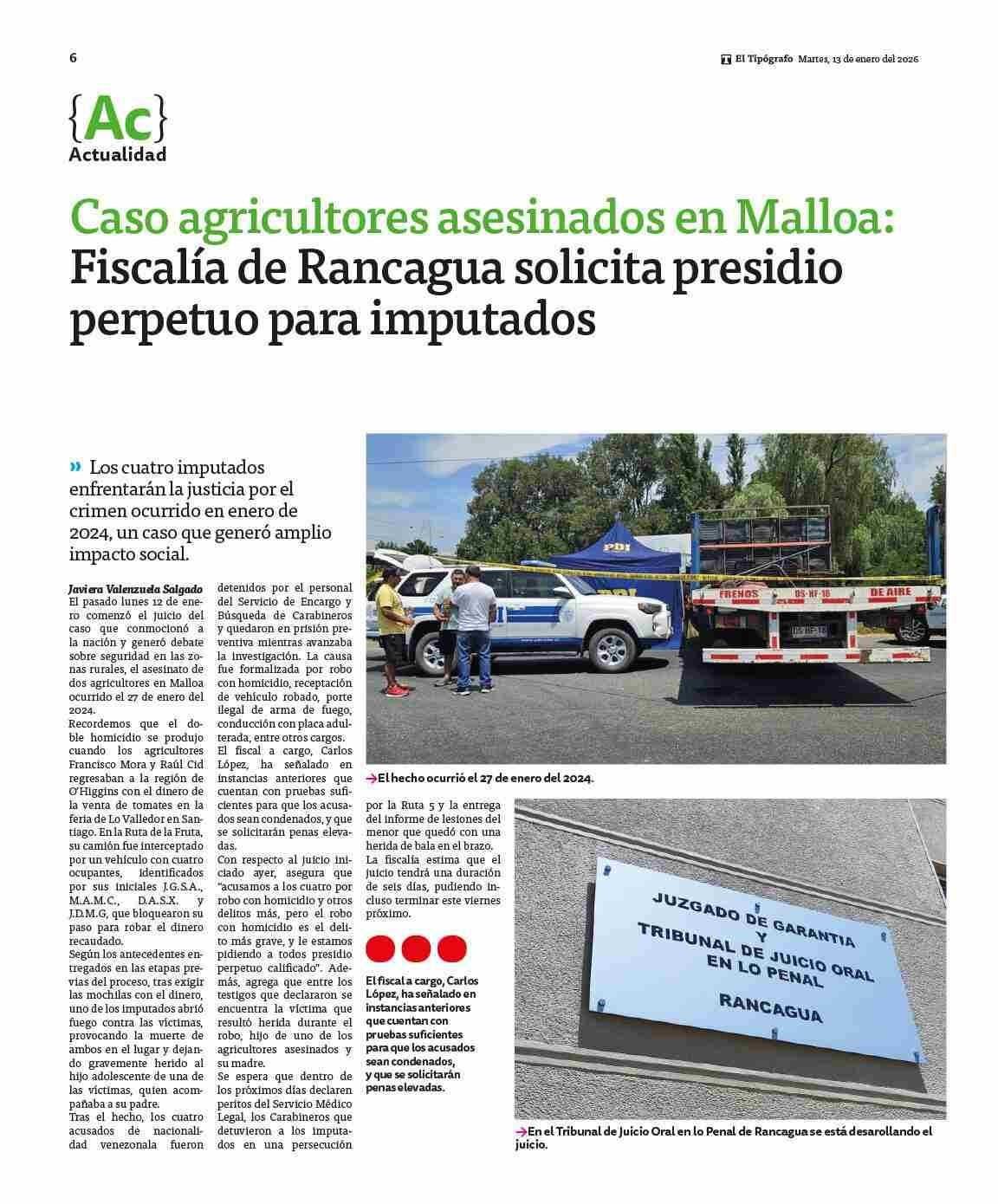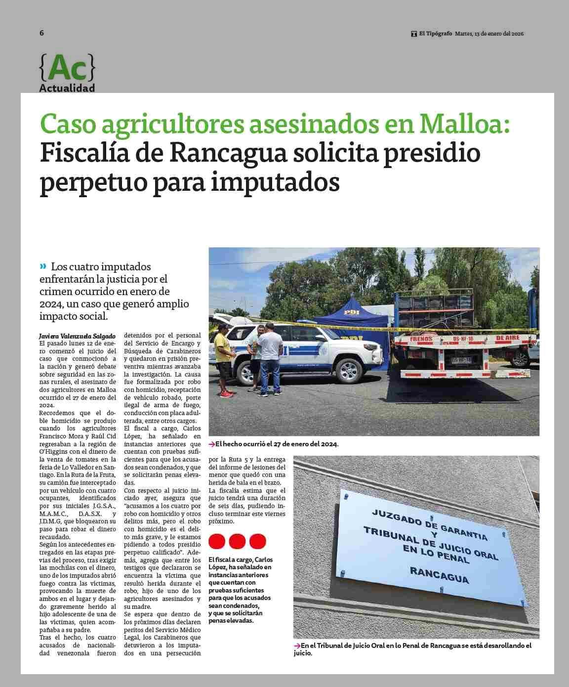 Caso agricultores asesinados en Malloa: Fiscalía de Rancagua solicita presidio perpetuo para imputados 13-01-2026 El Tipógrafo |