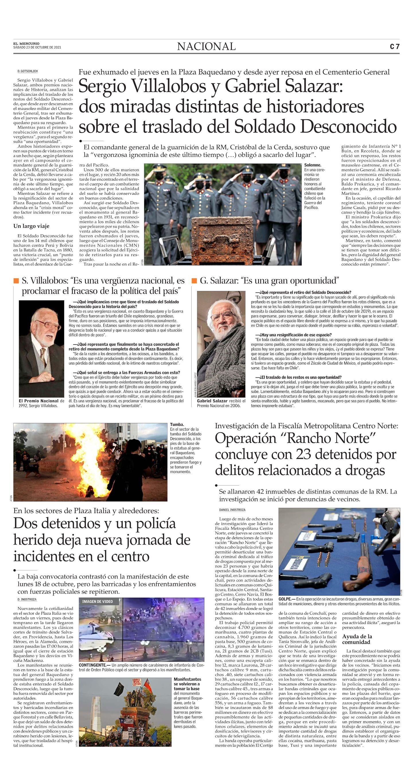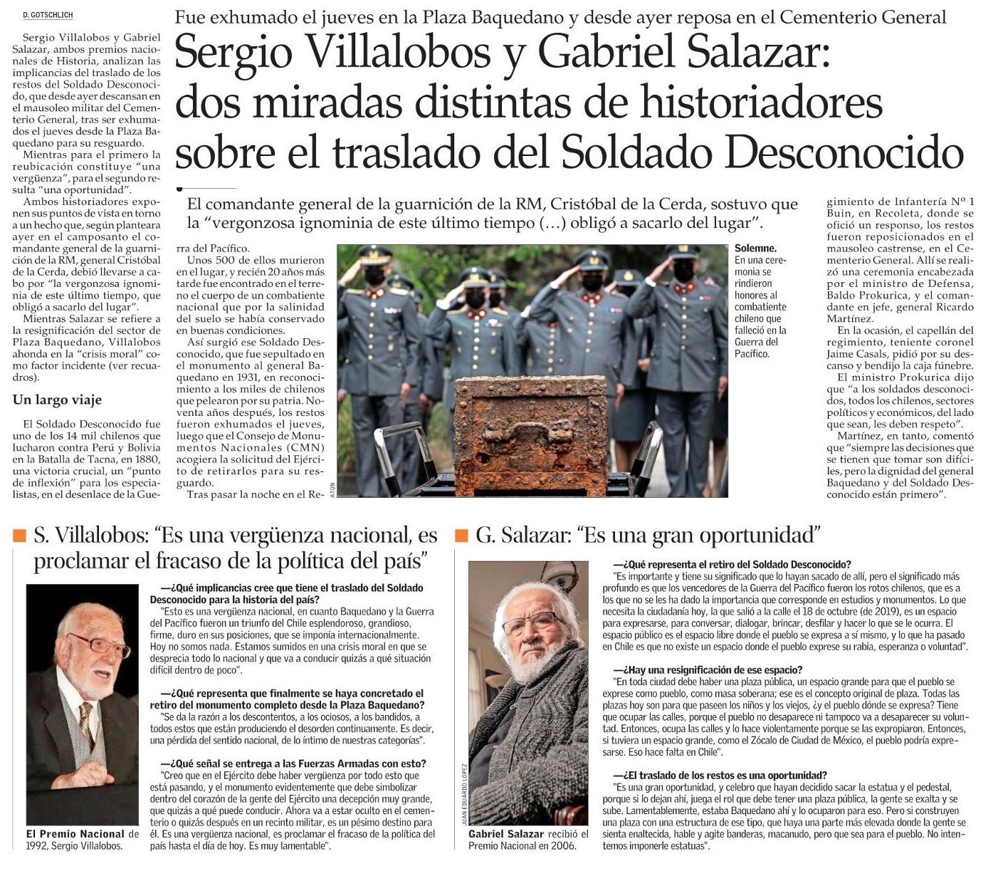 Sergio Villalobos y Gabriel Salazar: dos miradas distintas de historiadores sobre el traslado del Soldado Desconocido 23-10-2021 El Mercurio |