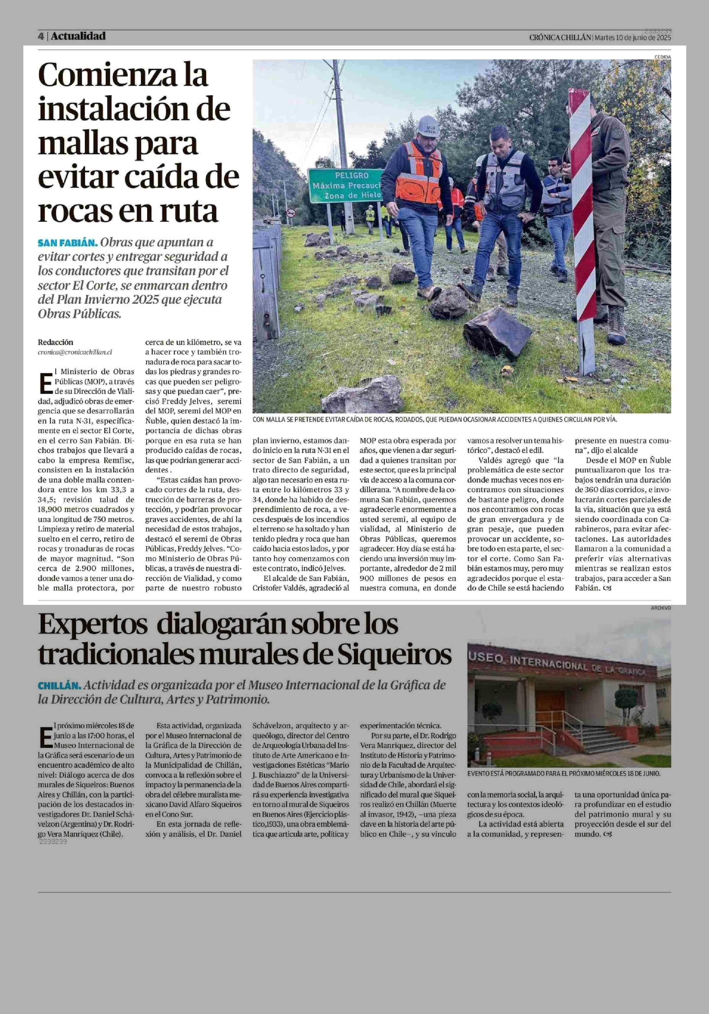 Comienza la instalación de mallas para evitar caída de rocas en ruta 10-06-2025 Crónica de Chillán |
