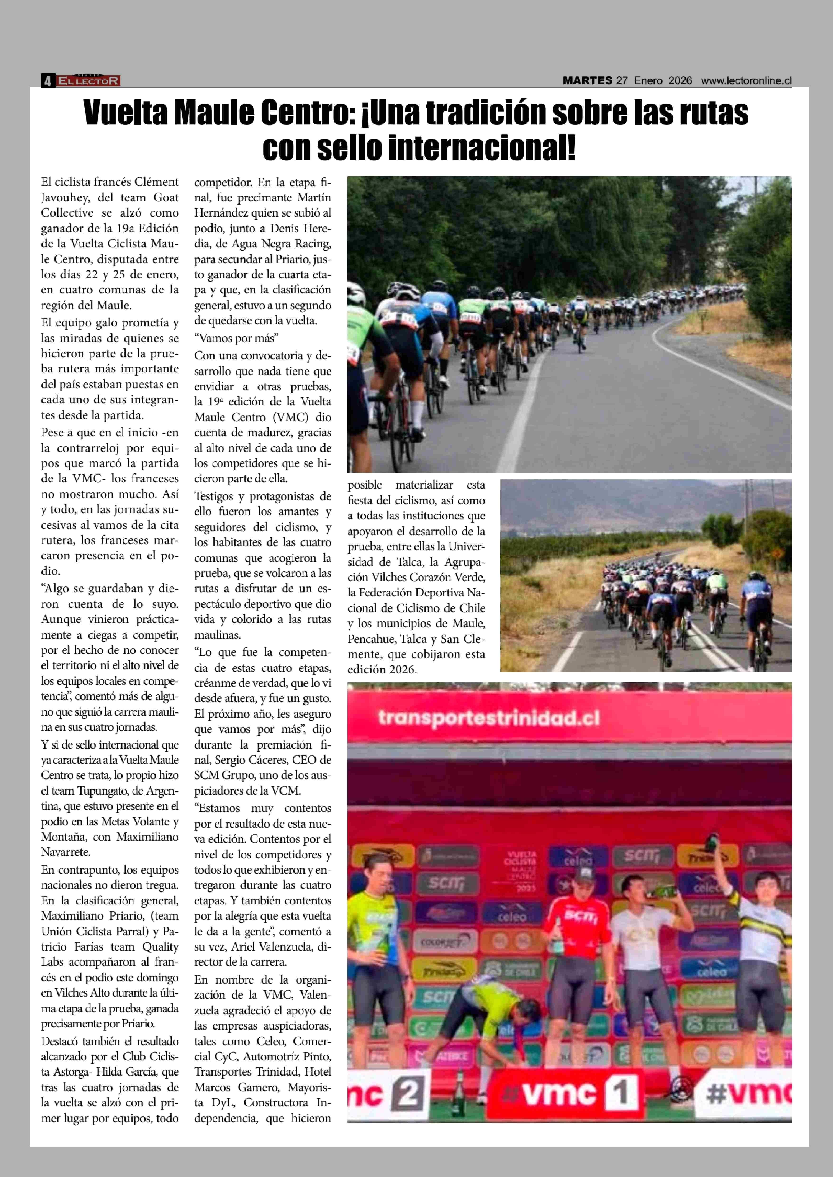 Vuelta Maule Centro: ¡ Una tradición sobre las rutas con sello internacional! 27-01-2026 El Lector |