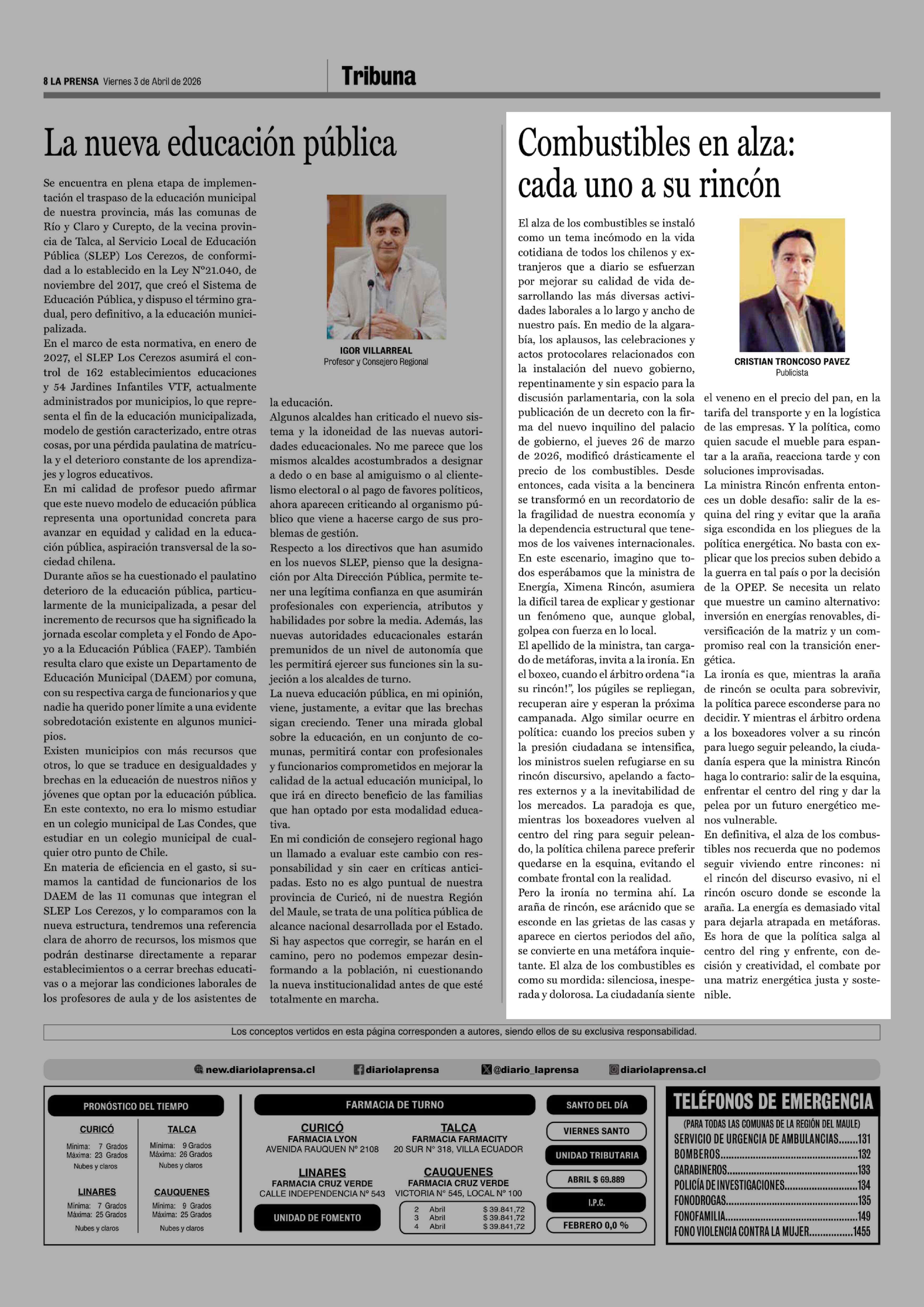 Columnas de Opinión: Combustibles en alza: cada uno a su rincón 03-04-2026 La Prensa de Curicó |