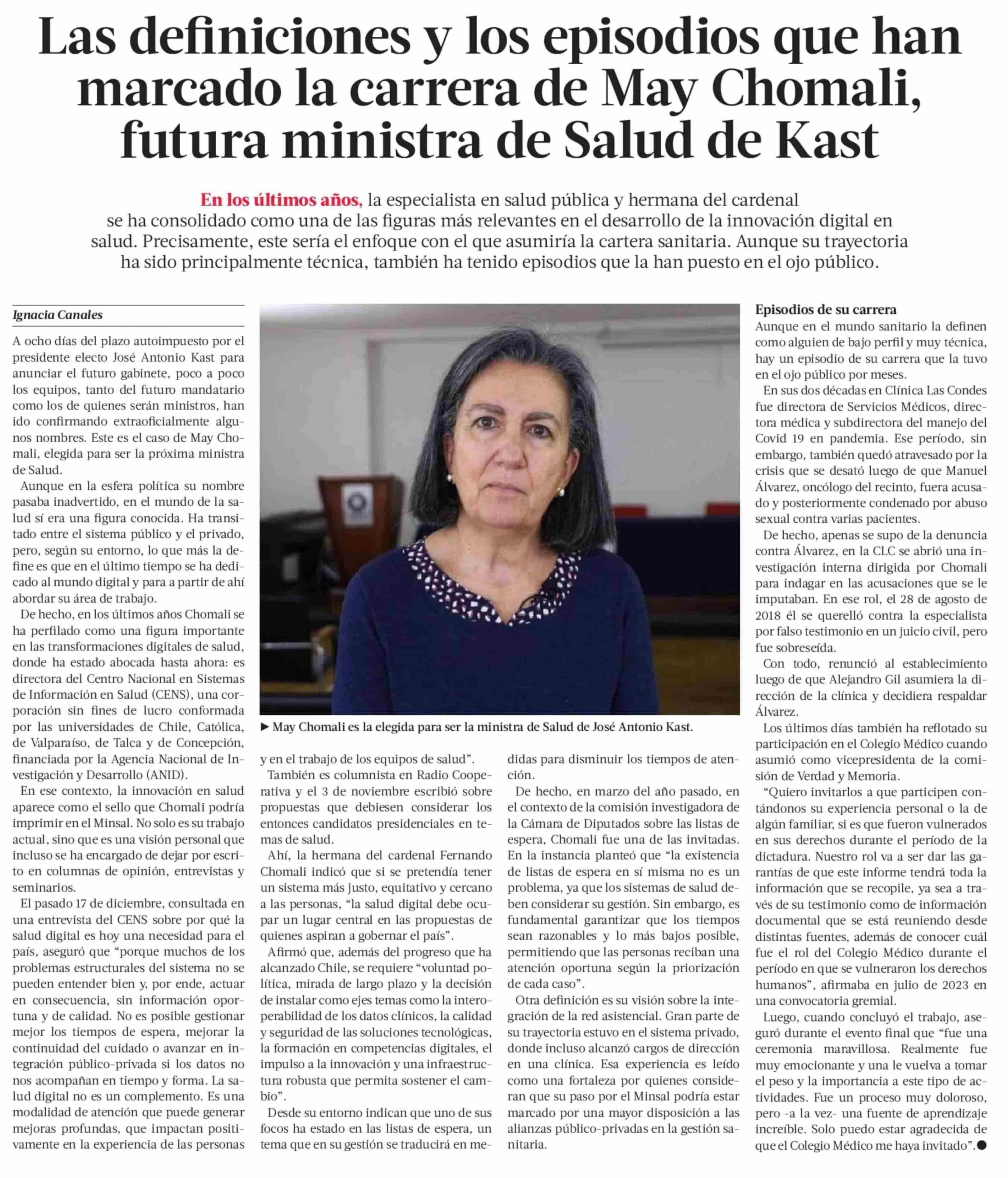 | Título: | Las definiciones y los episodios que han marcado la carrera de May Chomali, futura ministra de Salud de Kast |