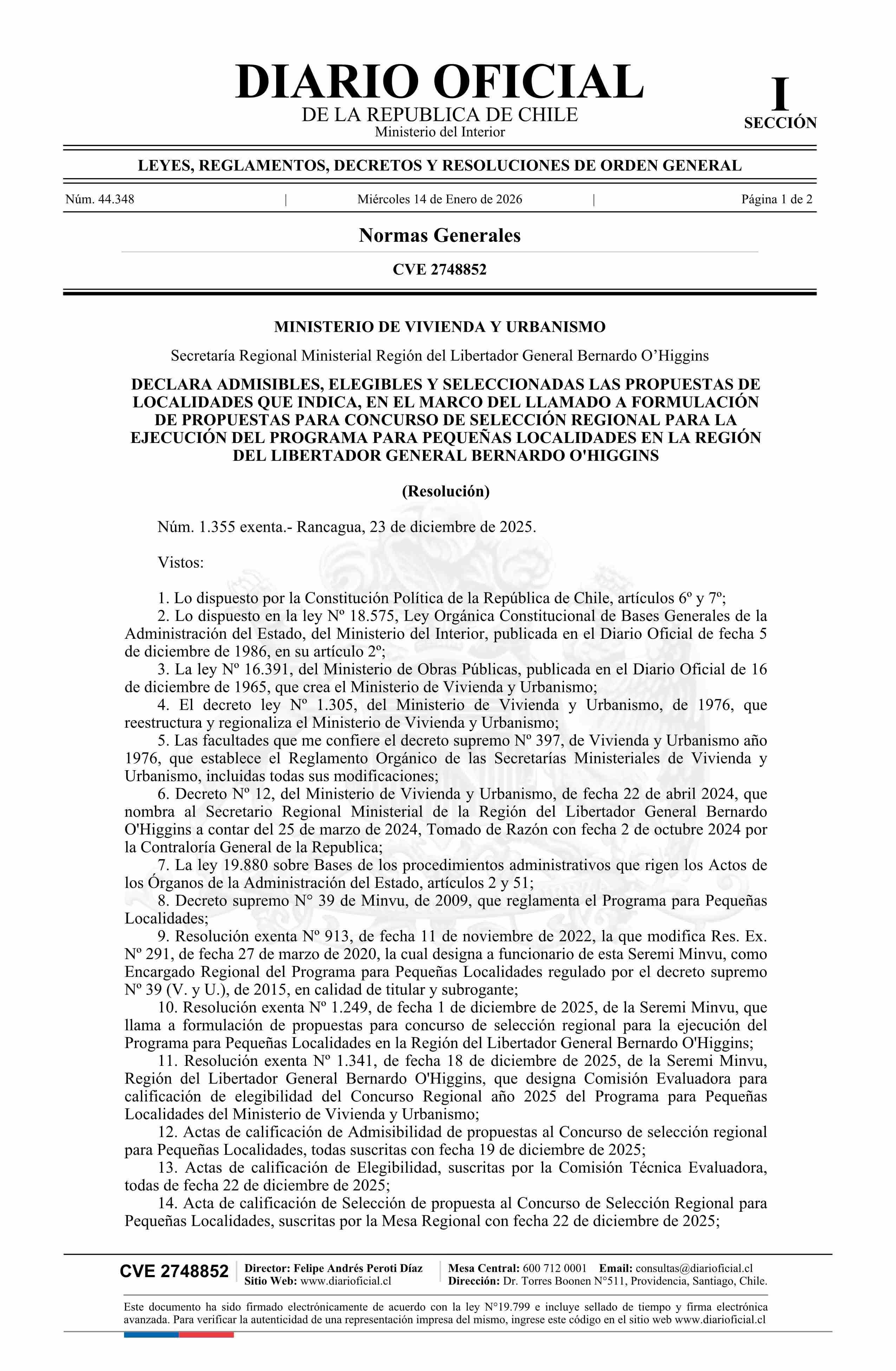 Título: Resolución exenta número 1.355, de 2025.- Declara admisibles, elegibles y seleccionadas las propuestas de localidades que indica, en el marco del llamado a formulación de propuestas para concurso de selección regional para la ejecución del Programa para Pequeñas Localidades en la Región del Libertad