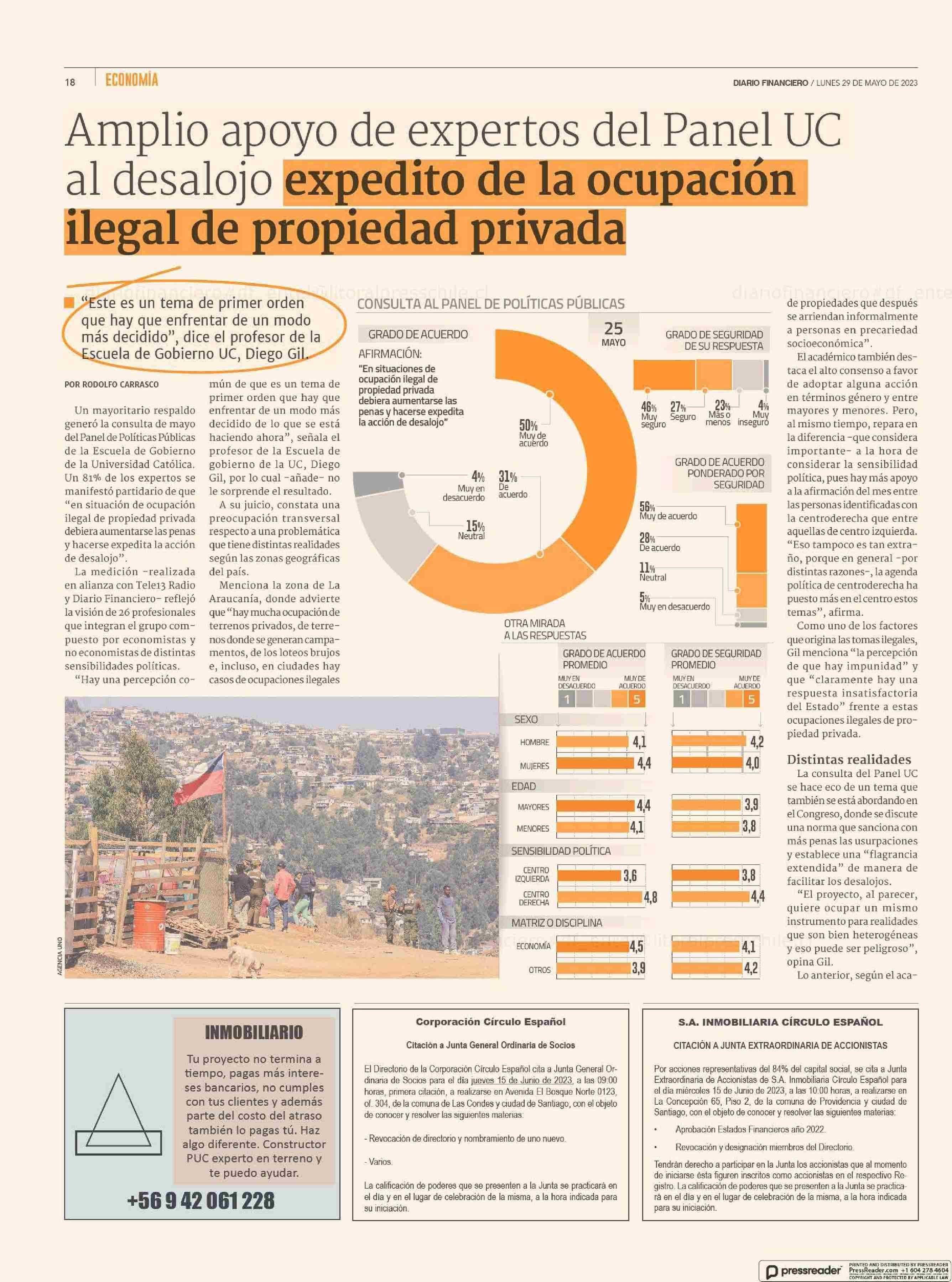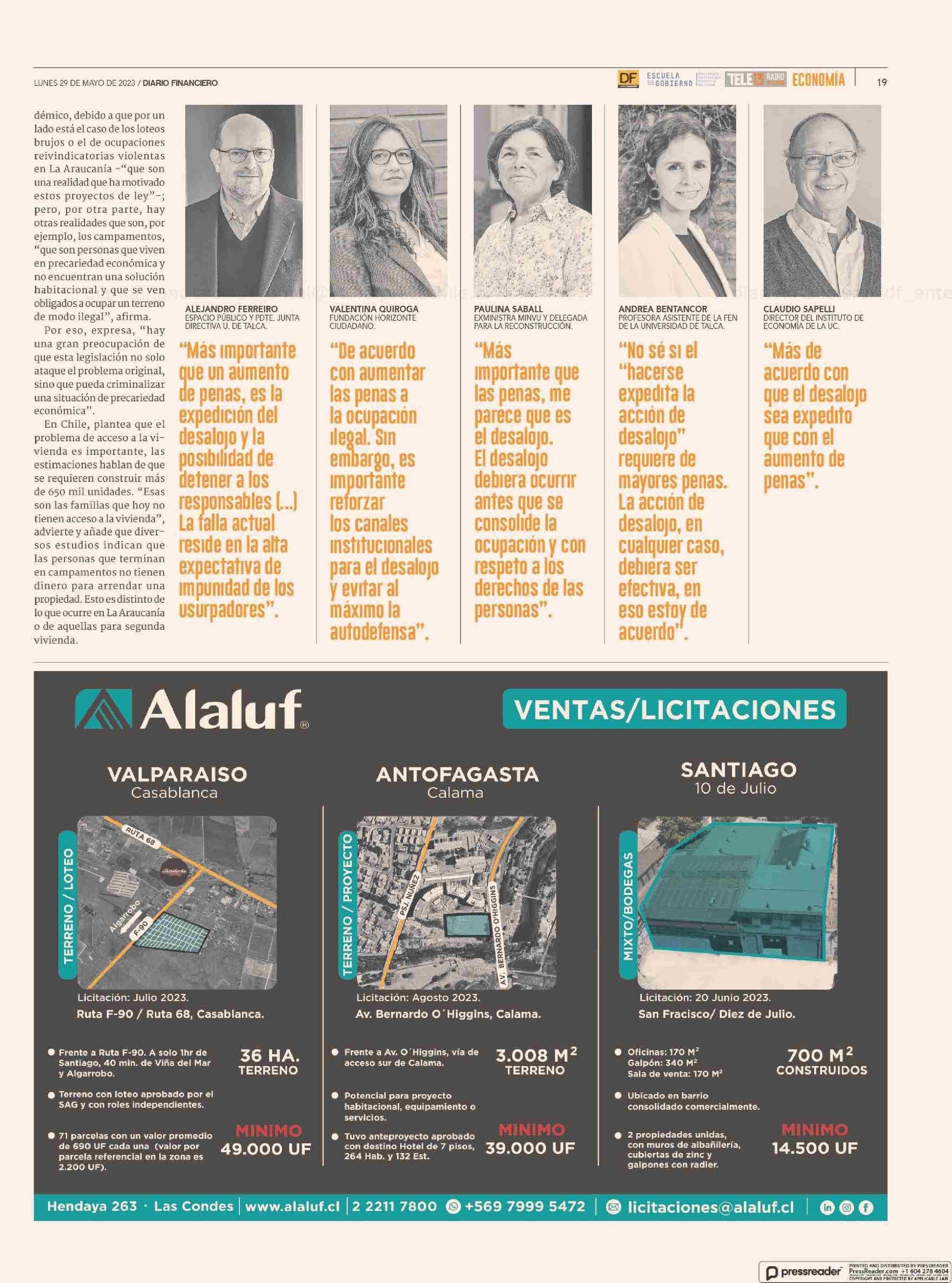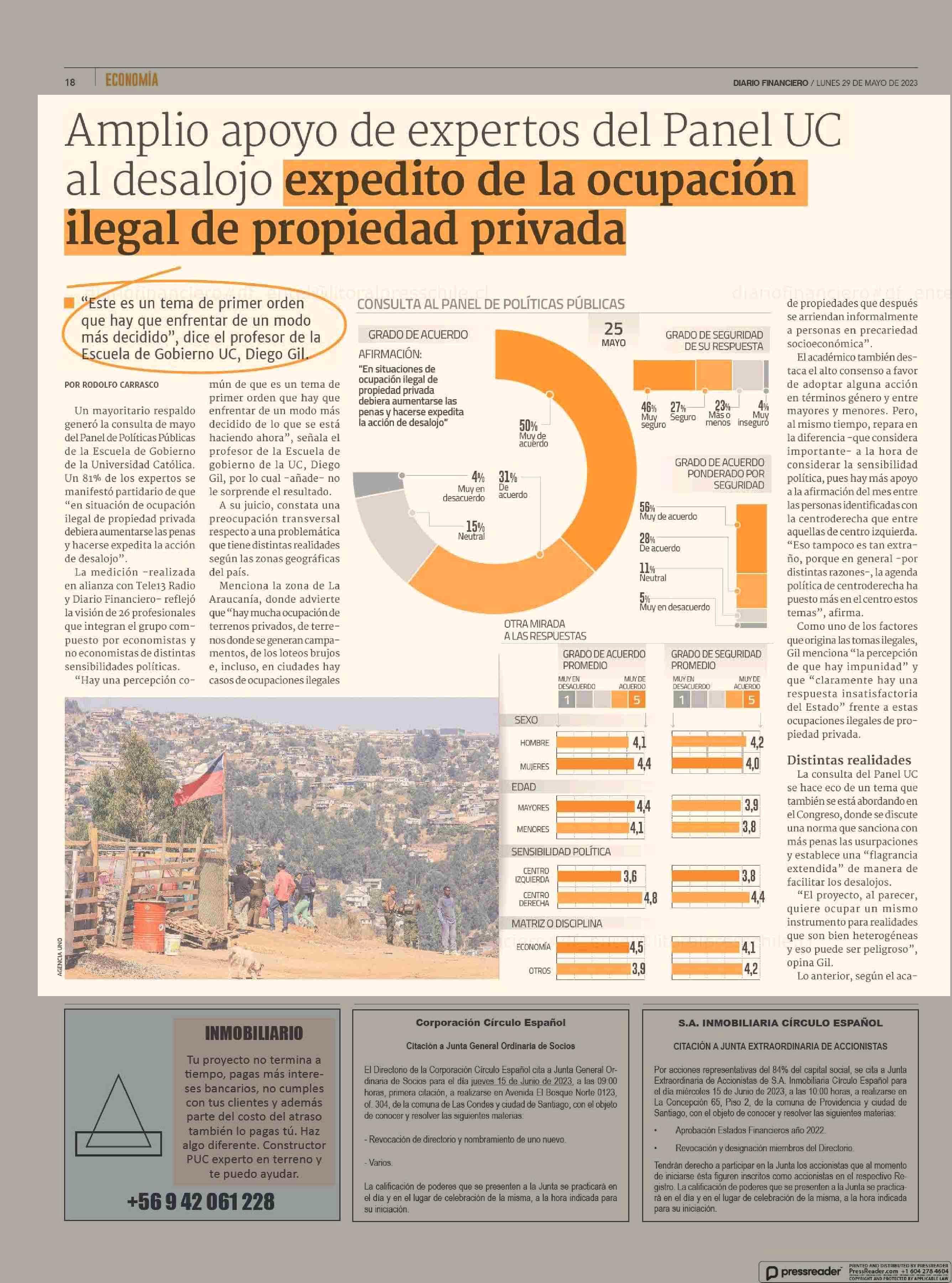 Amplio apoyo de expertos del Panel UC al desalojo expedito de la ocupación ilegal de propiedad privada 29-05-2023 Diario Financiero |