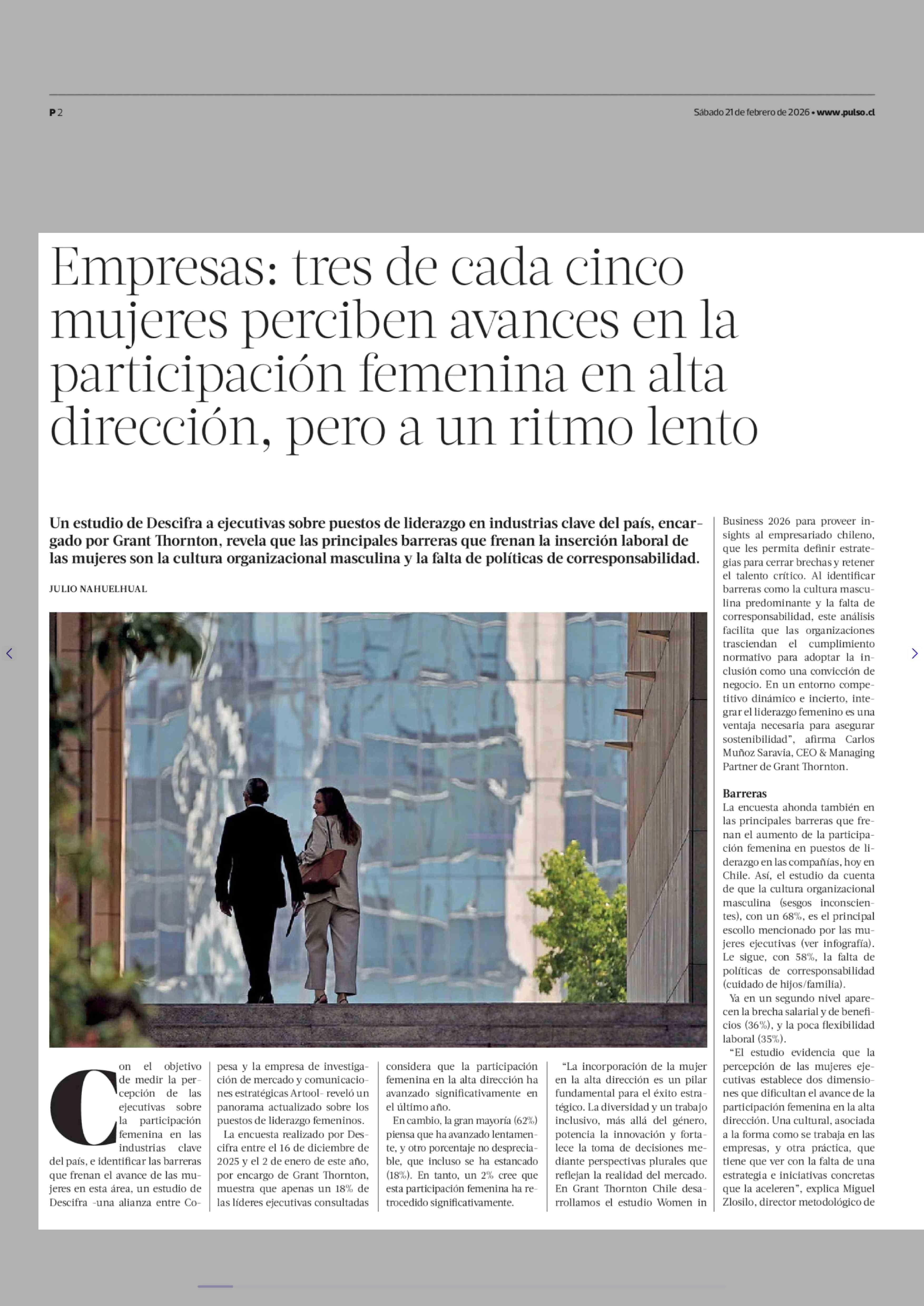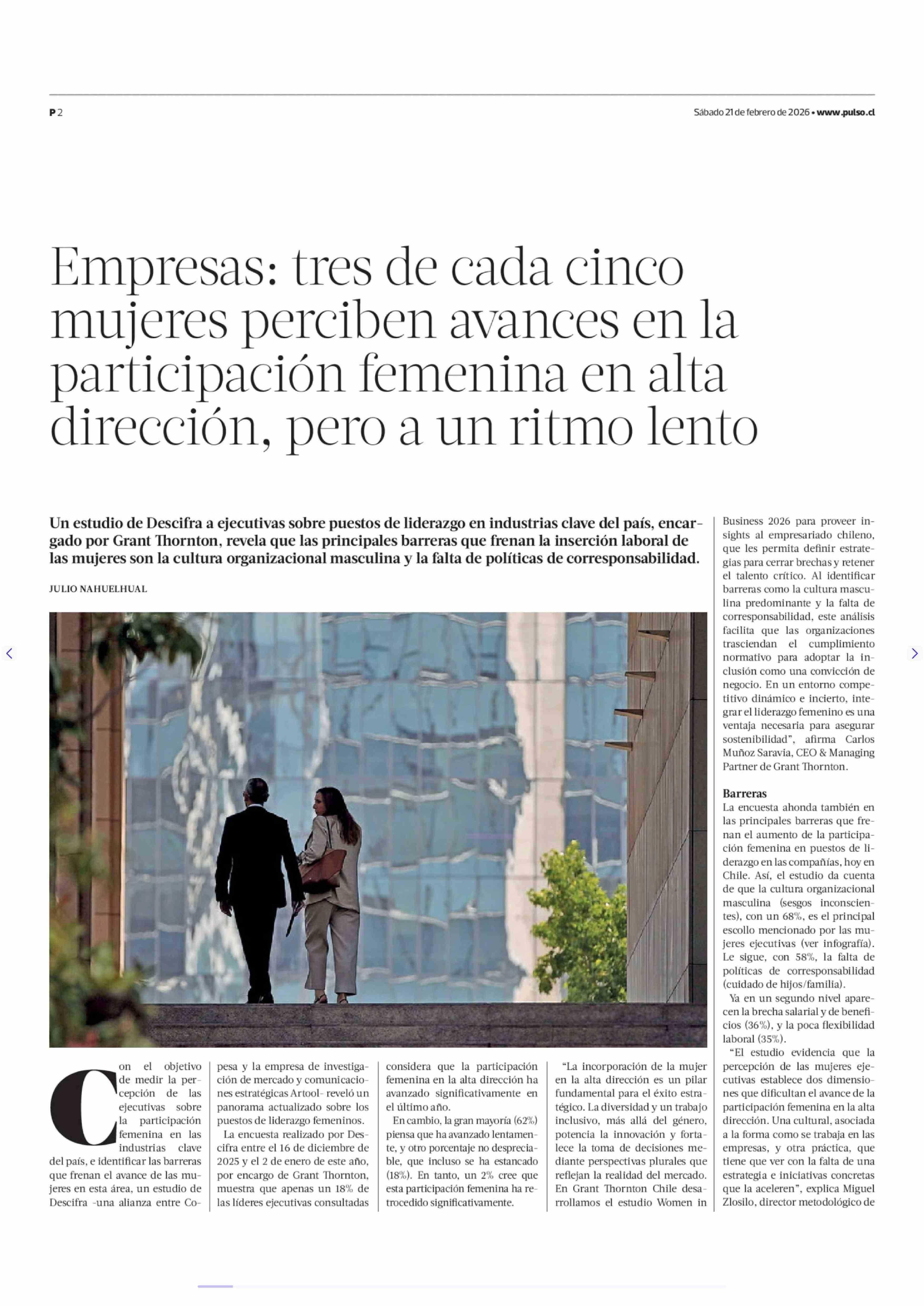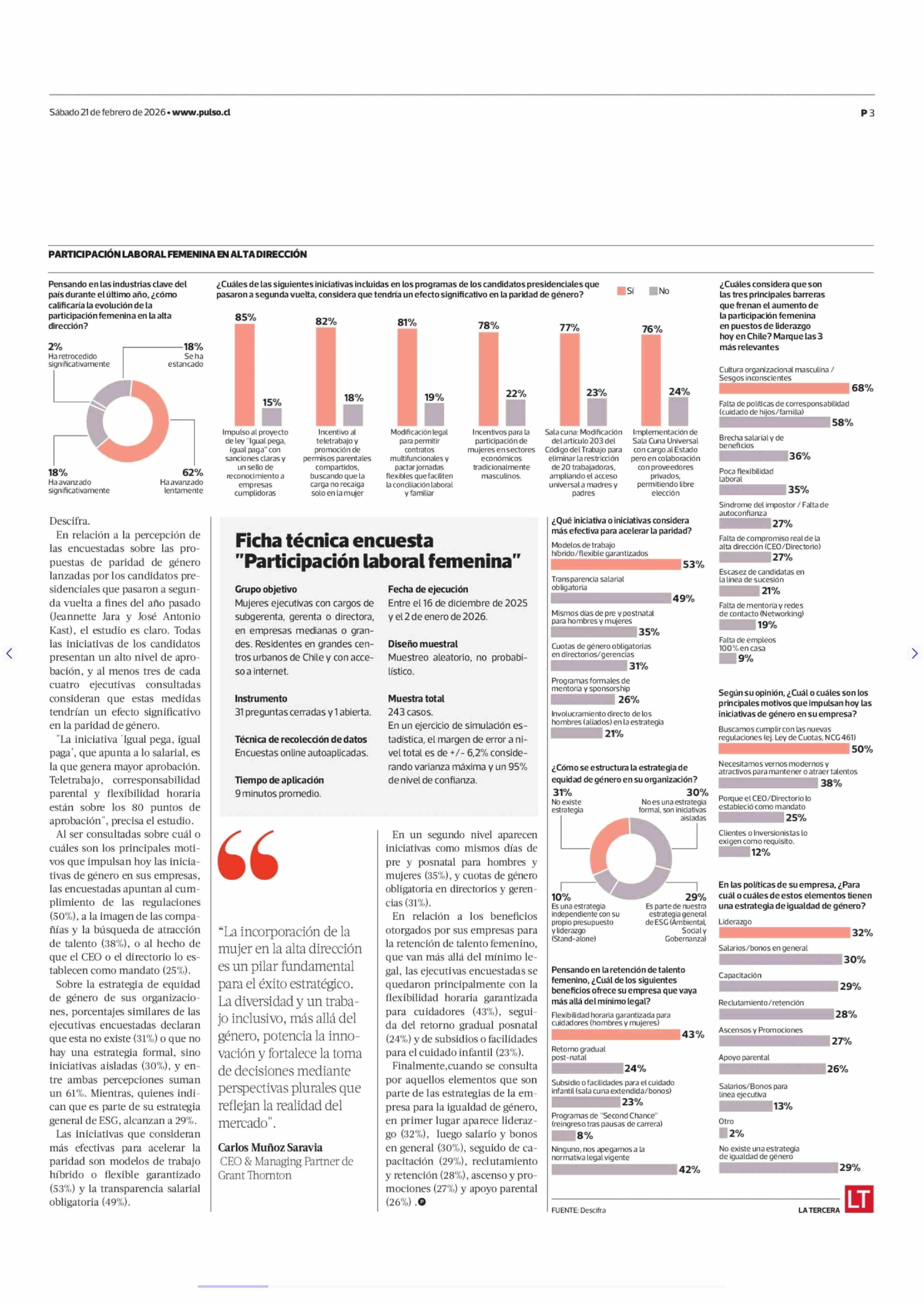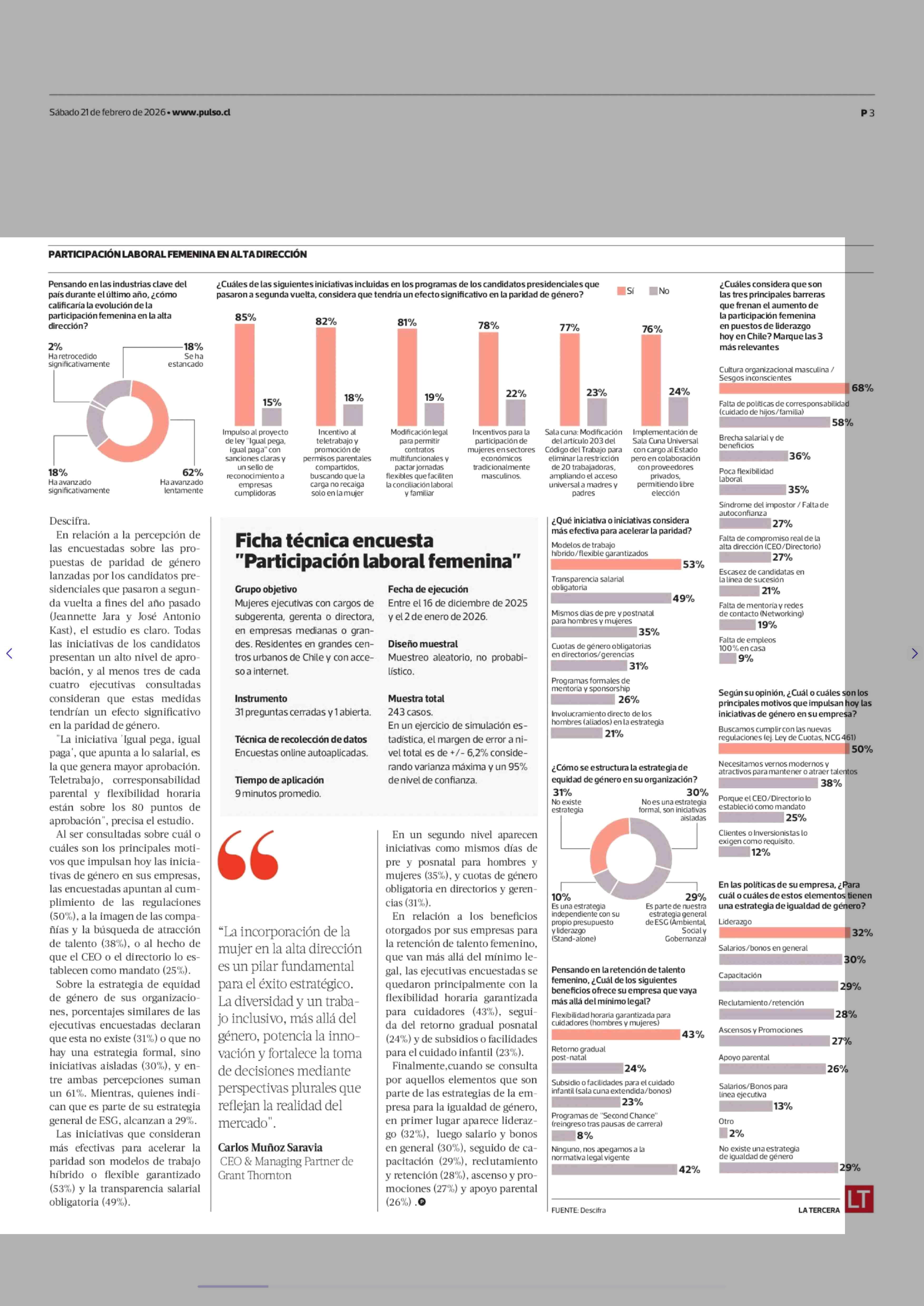 Empresas: tres de cada cinco mujeres perciben avances en la participación femenina en alta dirección, pero a un ritmo lento 21-02-2026 La Tercera |