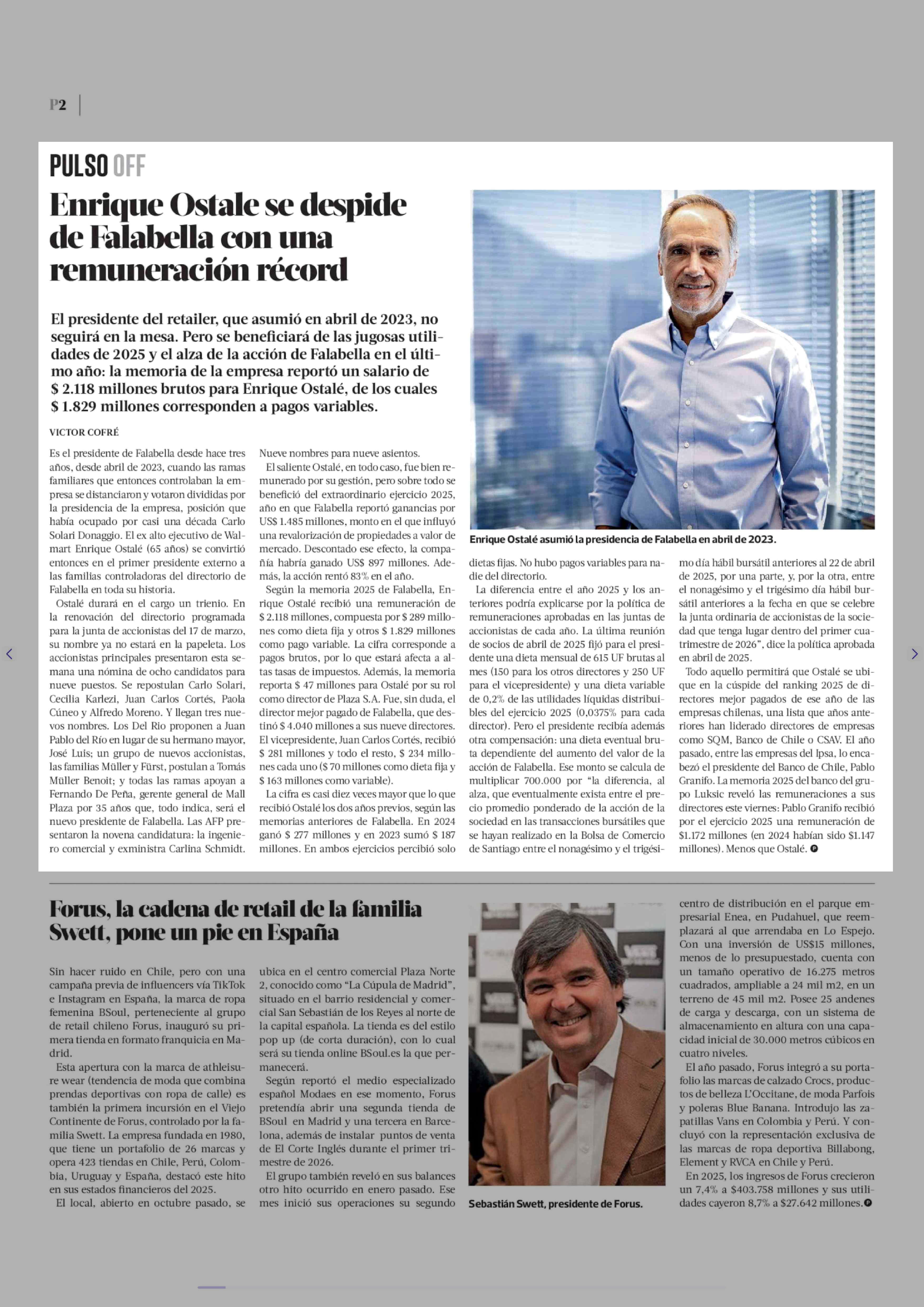 Enrique Ostale se despide de Falabella con una remuneración récord 08-03-2026 La Tercera |