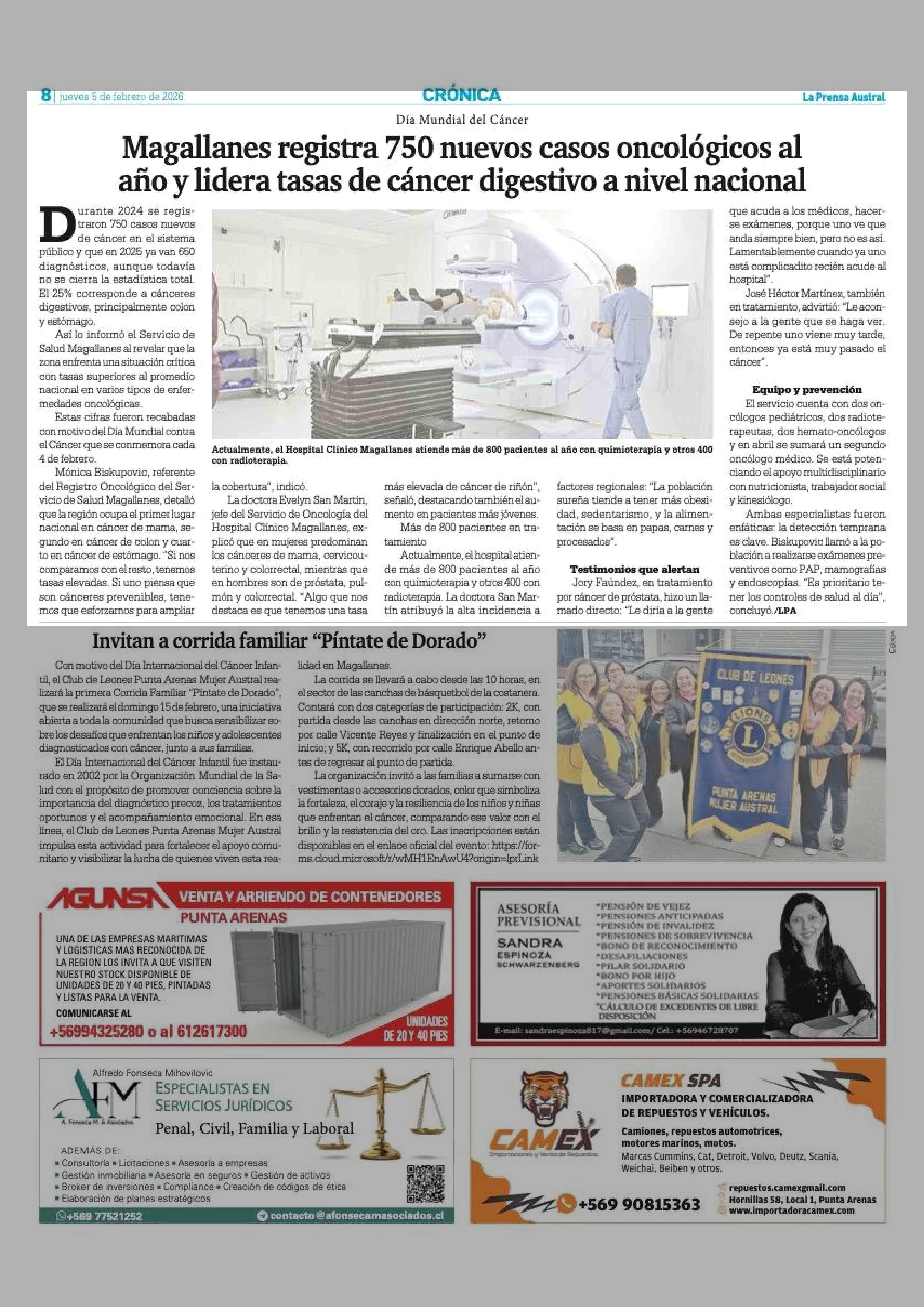 Magallanes registra 750 nuevos casos oncológicos al año y lidera tasas de cáncer digestivo a nivel nacional 05-02-2026 La Prensa Austral |