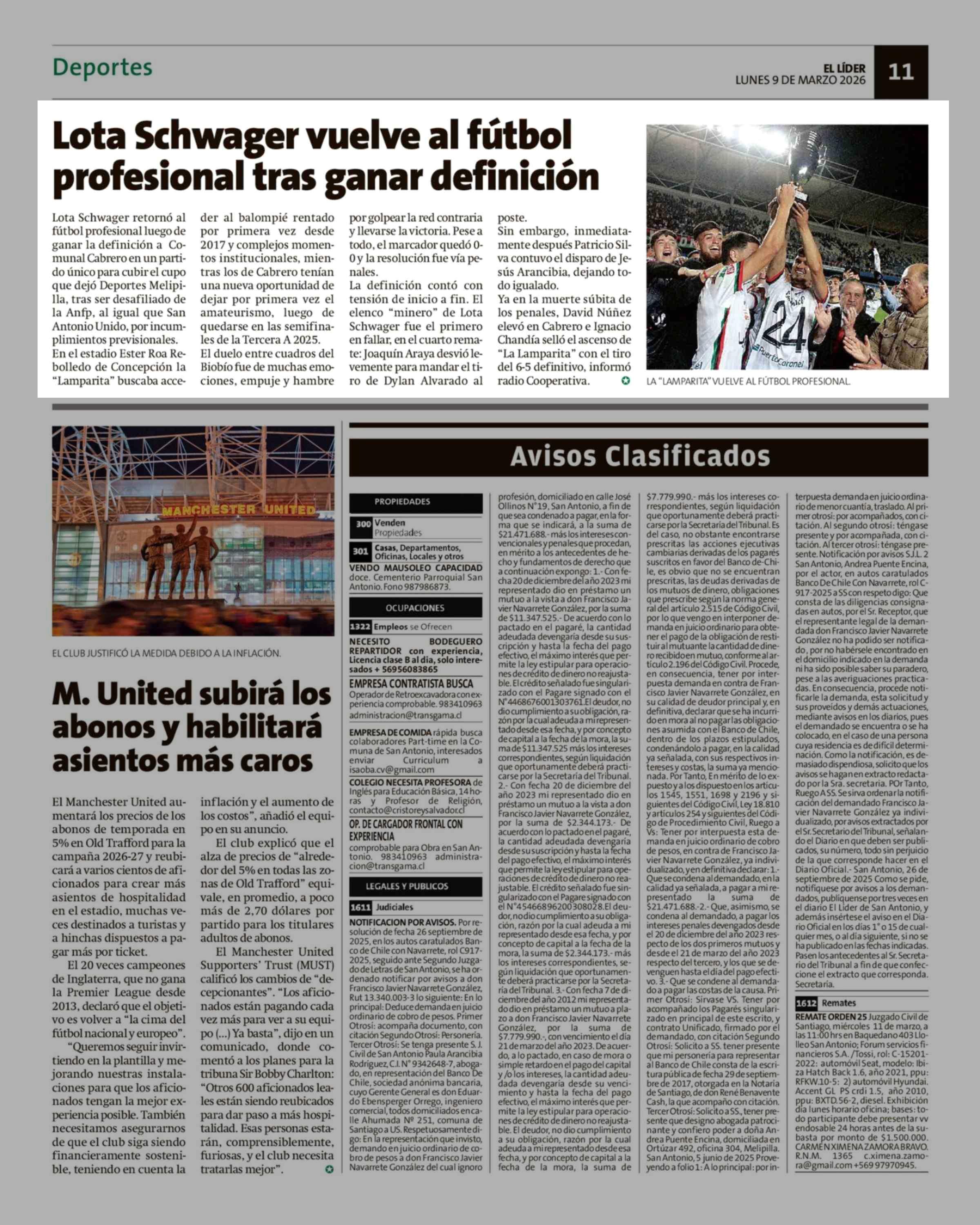 Lota Schwager vuelve al fútbol profesional tras ganar definición 09-03-2026 El Líder |