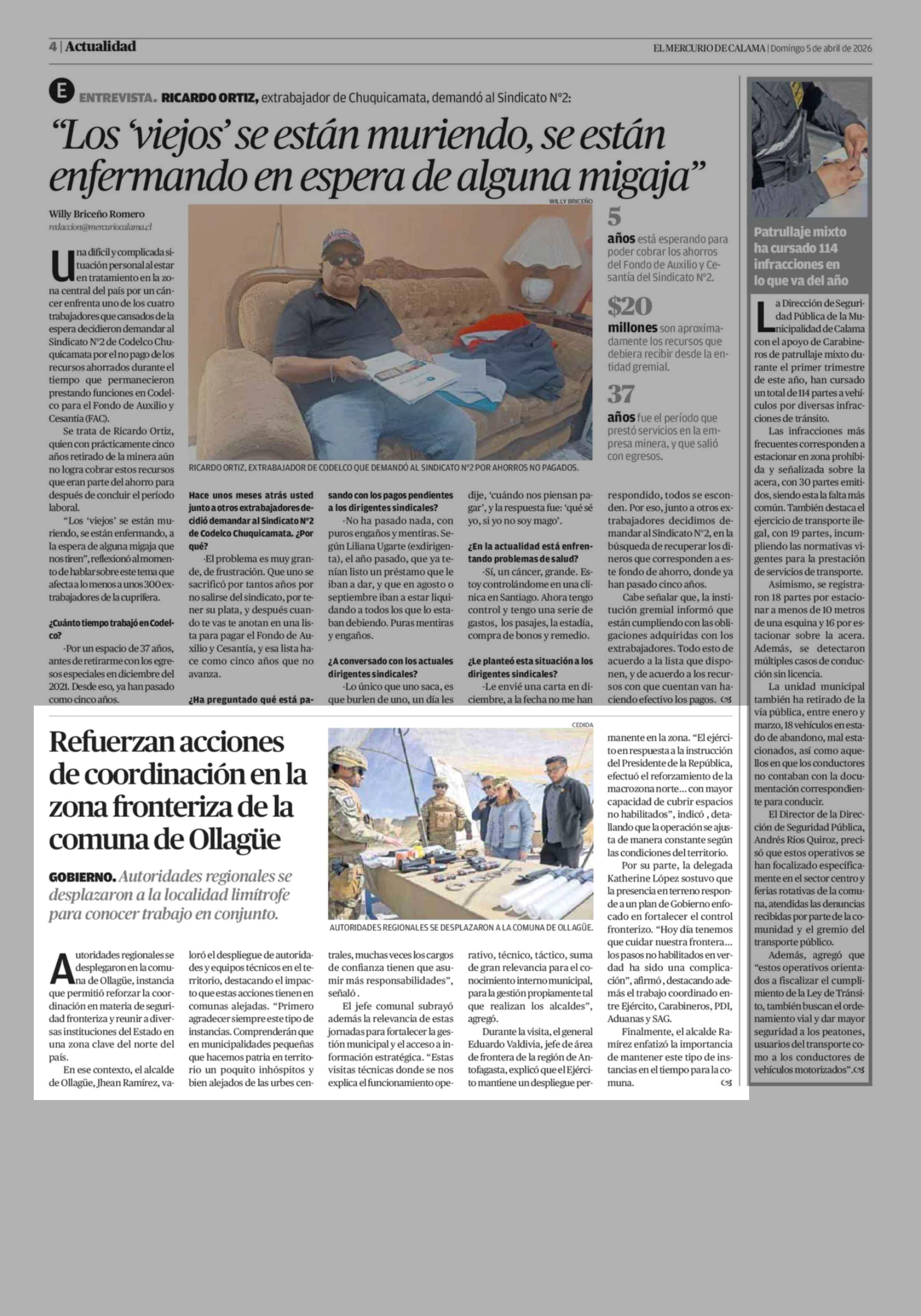 Refuerzan acciones de coordinación en la zona fronteriza de la comuna de Ollagüe 05-04-2026 El Mercurio de Calama |